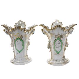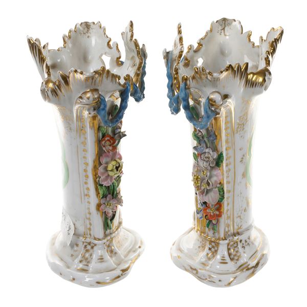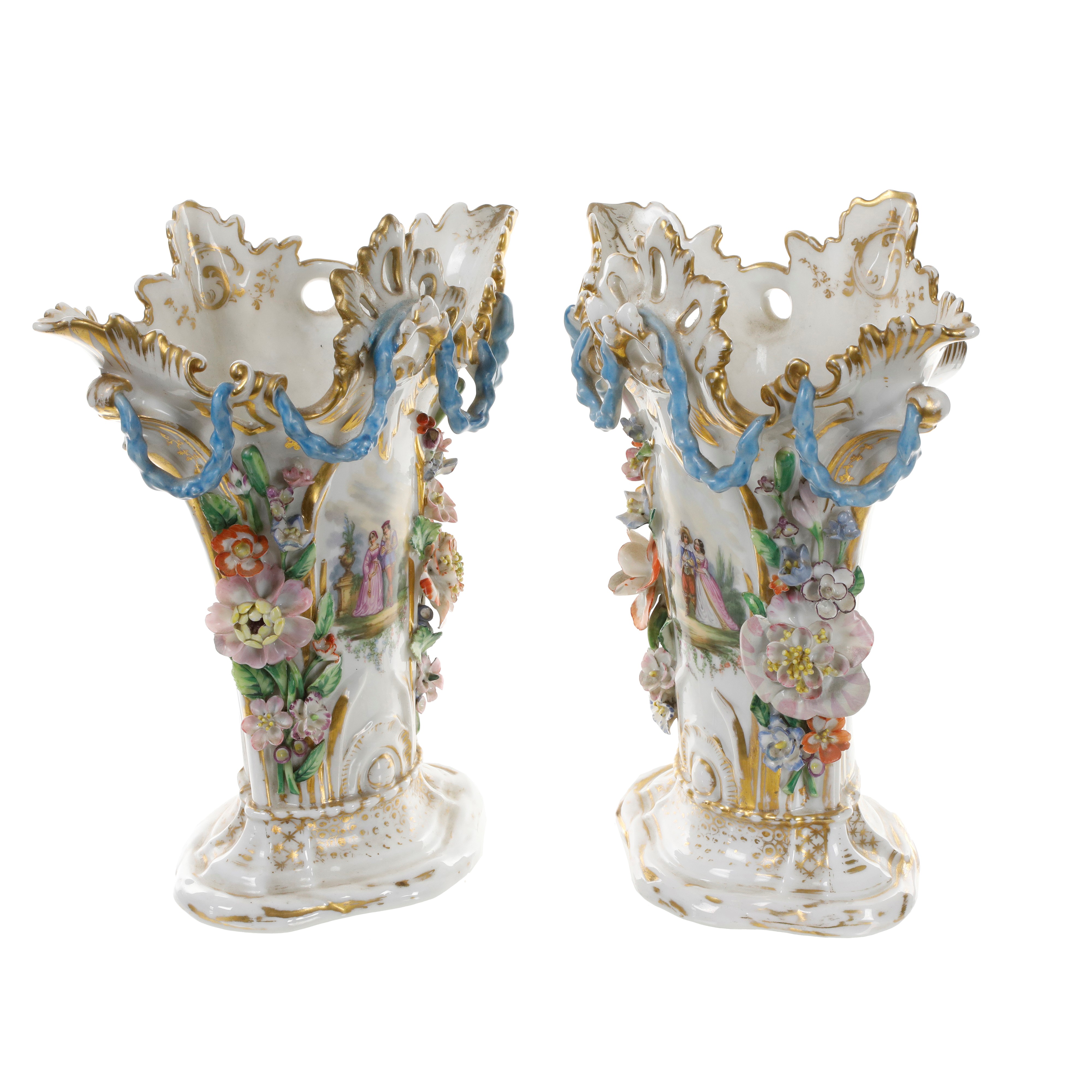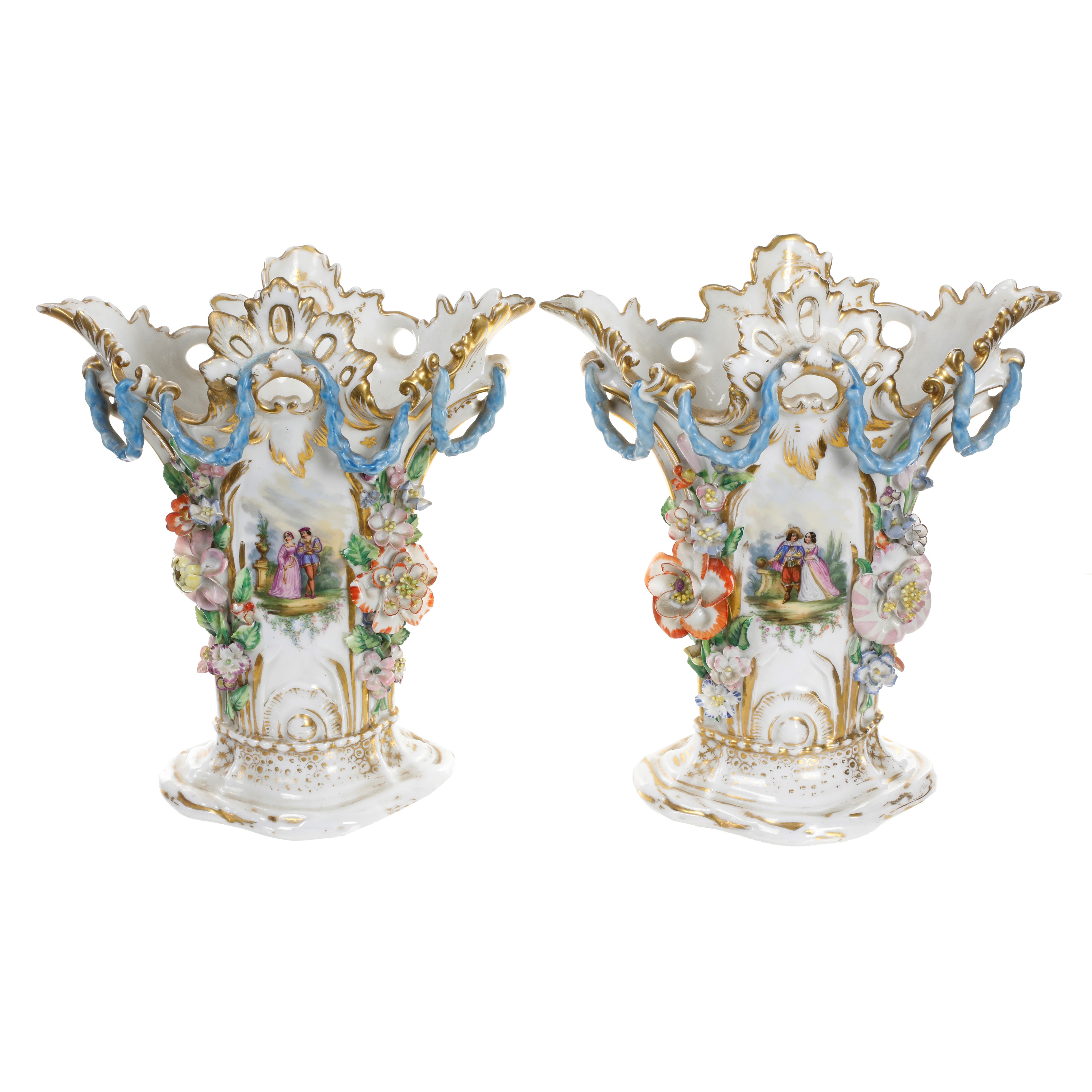 Coppia di vasi Luigi Filippo, decorati a volute e motivi floreali con scene romantiche di coppie in abiti rinascimentali.