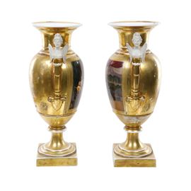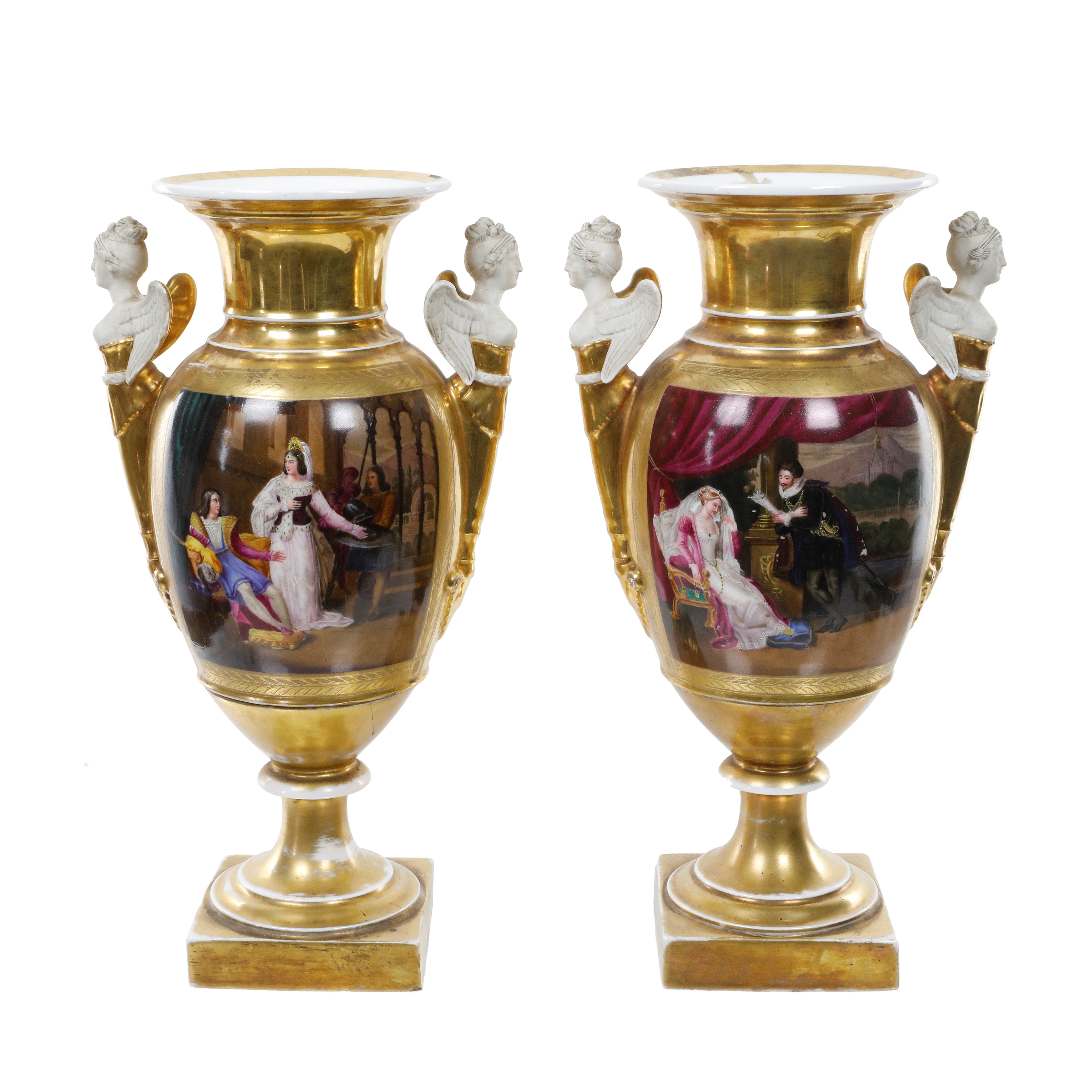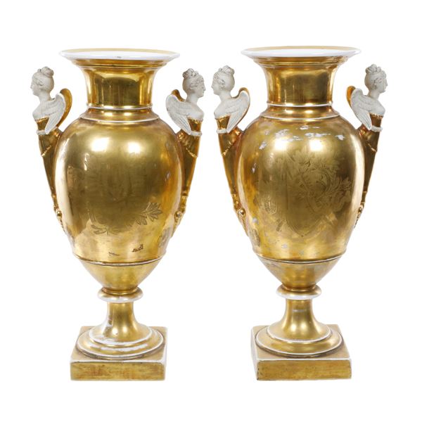 Coppia di vasi ad anfora con manici a forma di mezzo busto di donna alata, decorati con dipinti policromi.