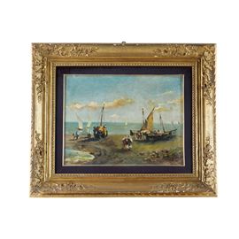 Cm 40,0 x 50,5 (cornice 67x77)Dipinto olio su tela raffigurante Marina con barche.