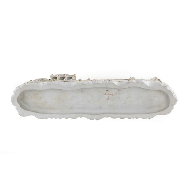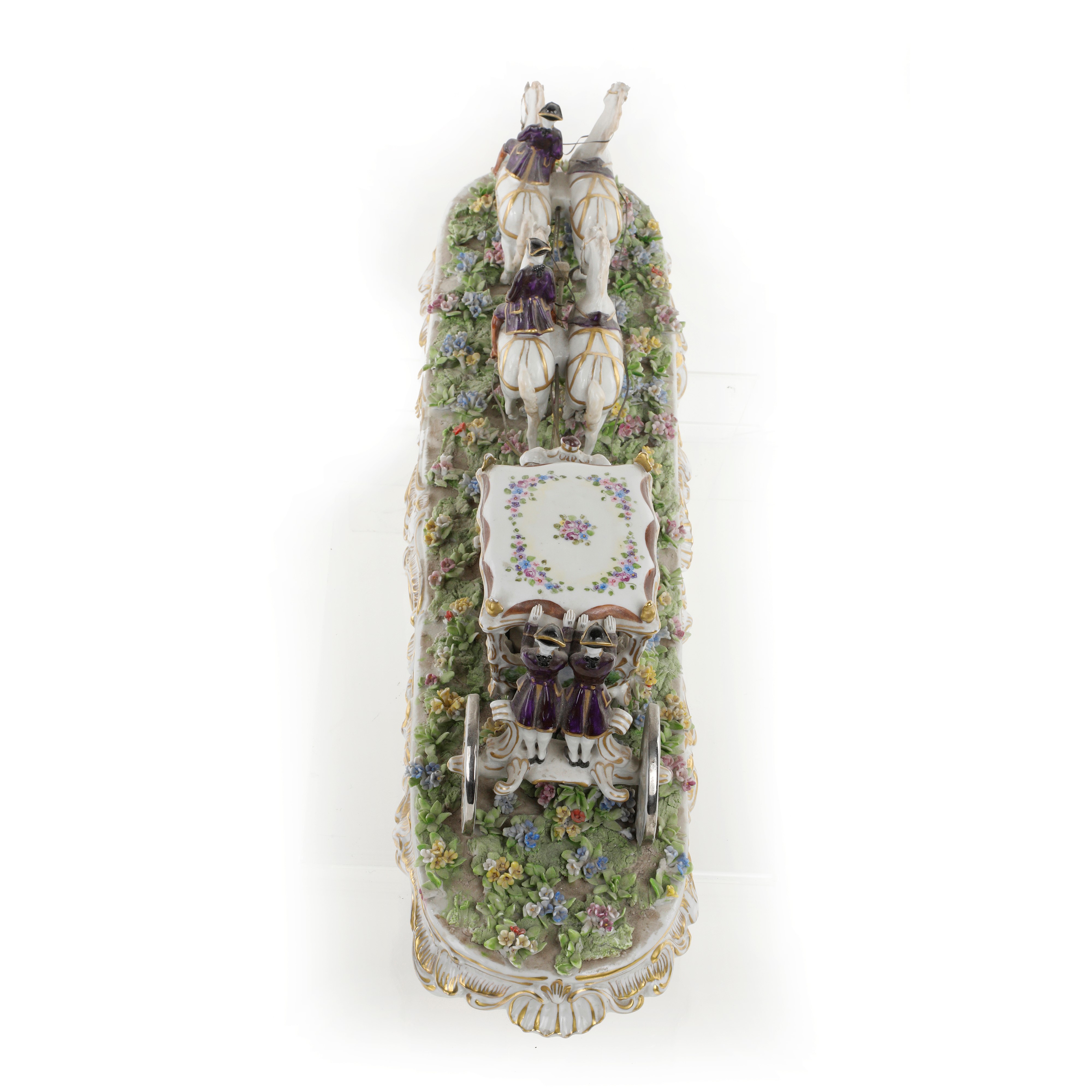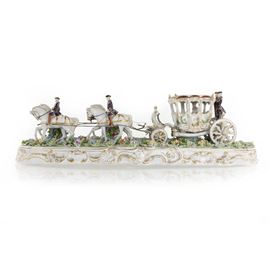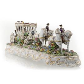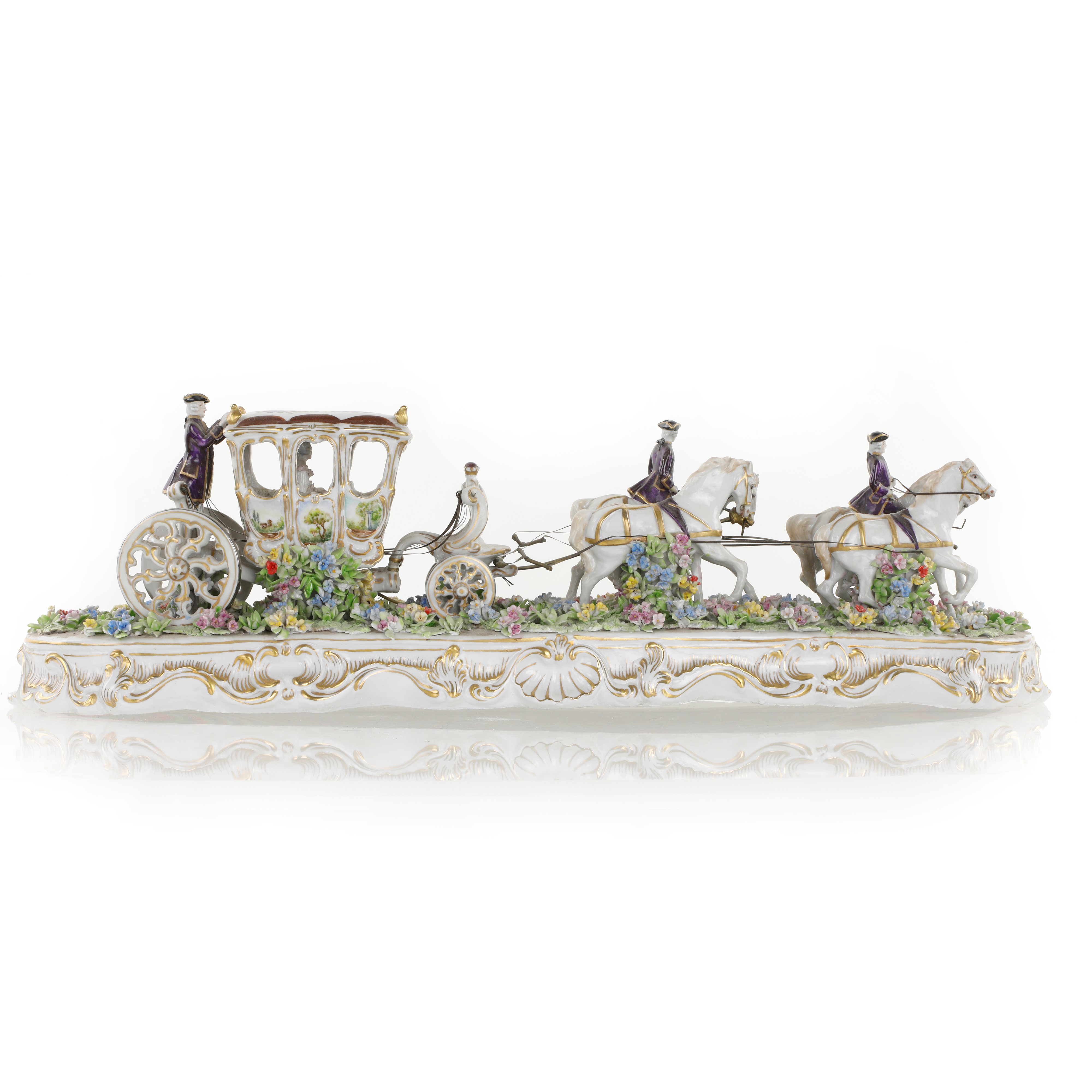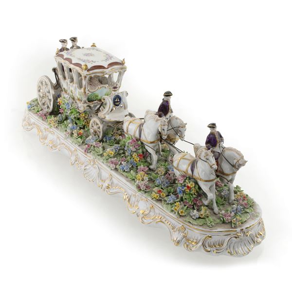 Scultura in porcellana di Capodimonte e Luigi Fabris, firmata, raffigurante una carrozza con all'interno una dama, trainata da 4 cavalli in un prato con molti fiori.