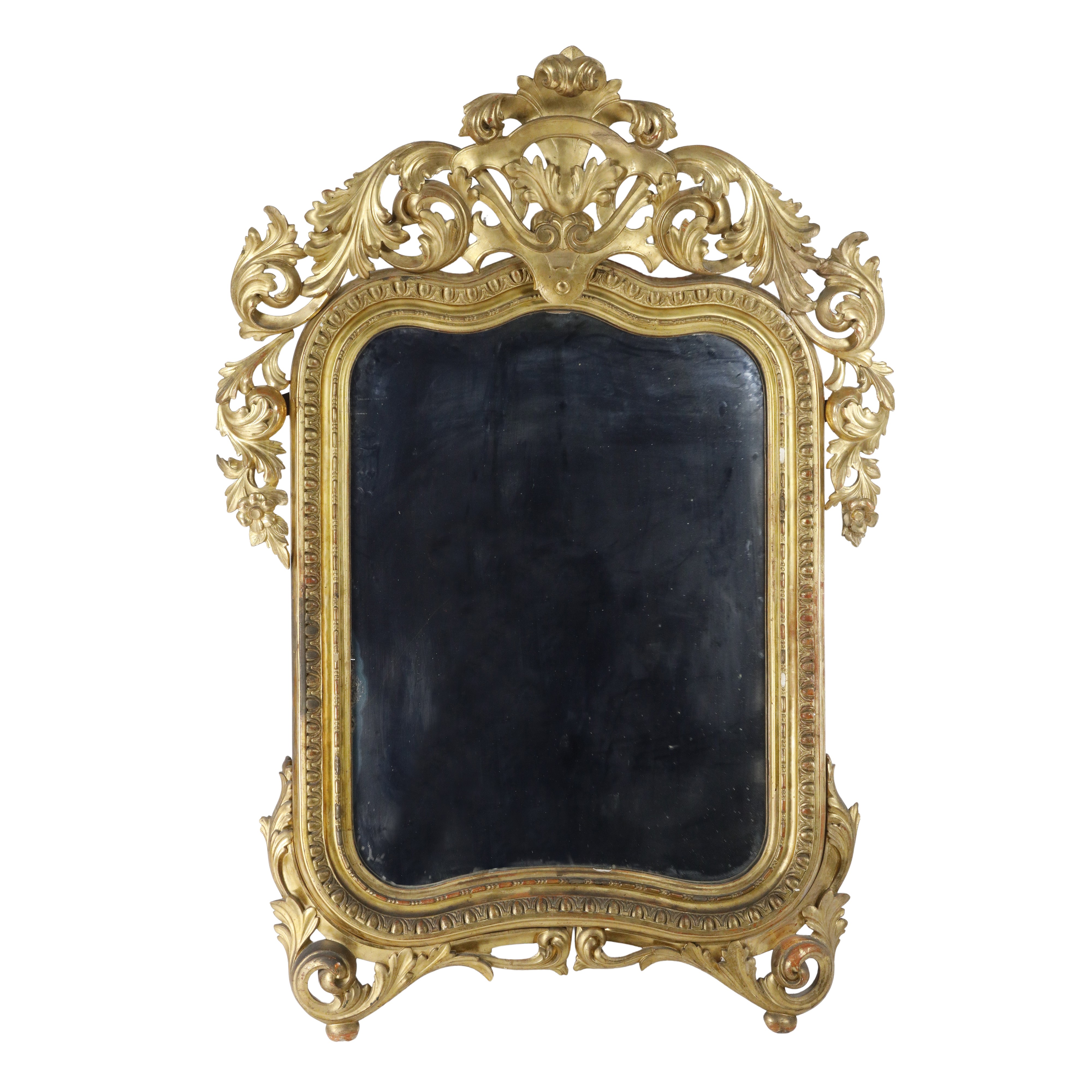 Specchiera in legno dorato a foglia oro, con cimasa e racemi laterali intagliati, poggiante su due piedini a foggia di volute.