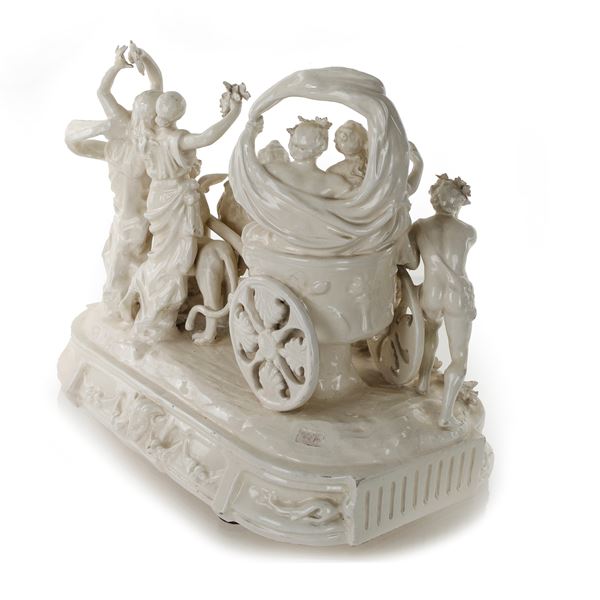 Gruppo in porcellana bianca raffigurante "Baccanale" in carro allegoria