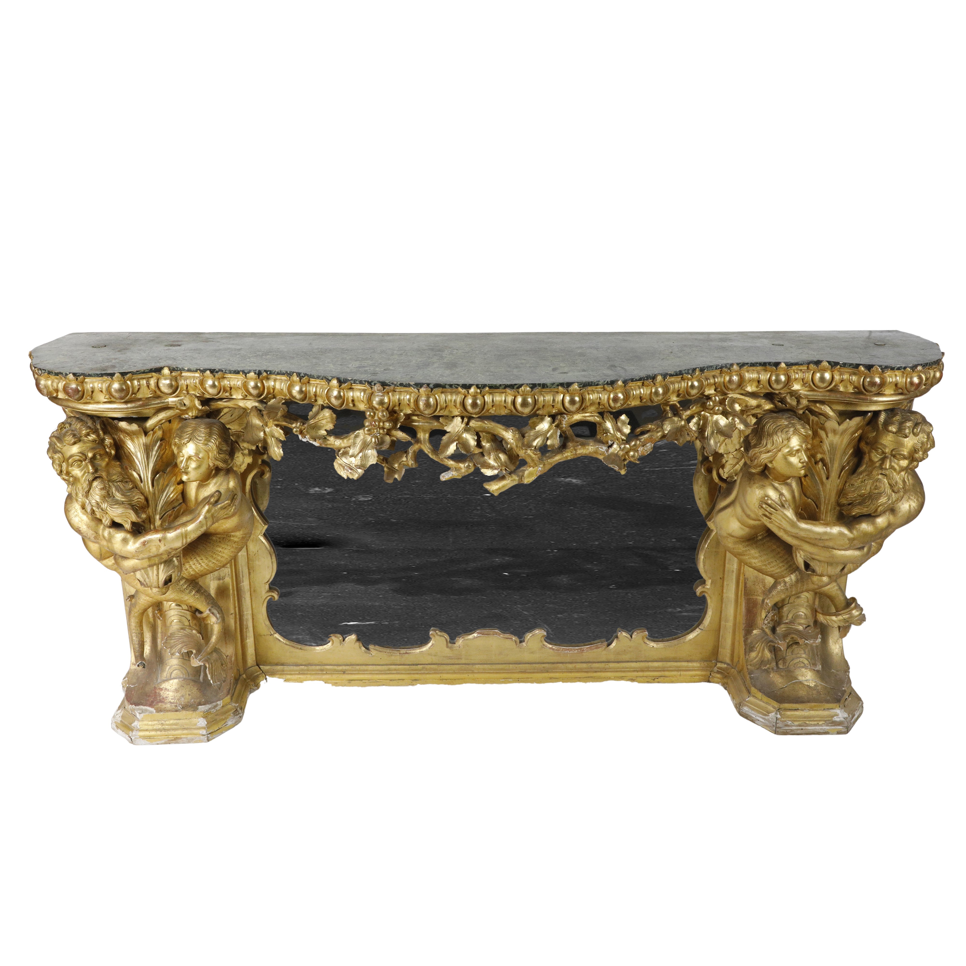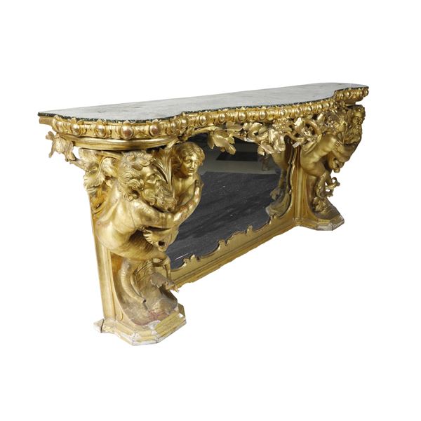 Straordinaria consolle monumentale dorata, di gusto barocco, di eccezionale impatto scenografico.