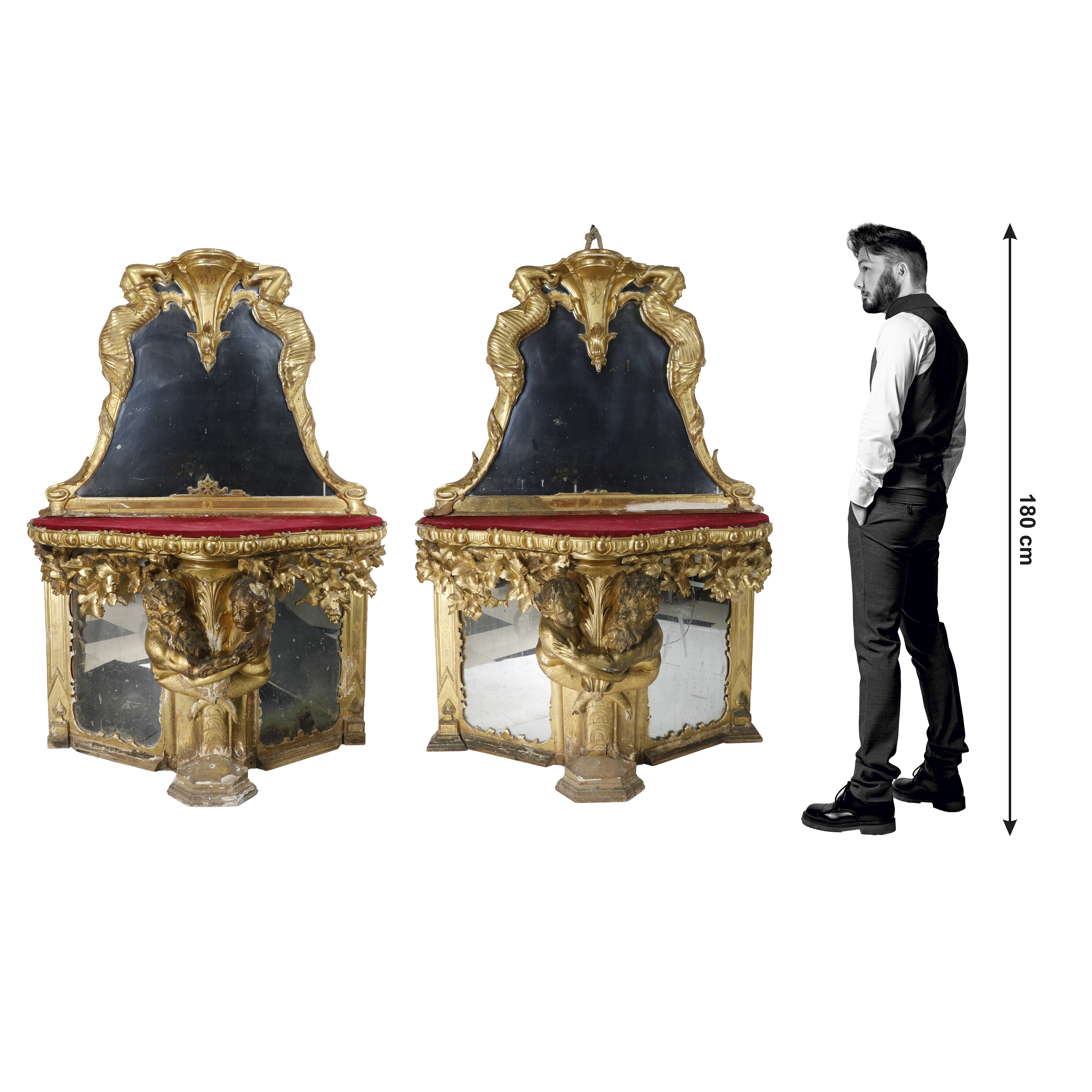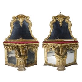 Le consolle si distinguono per la qualità dell’intaglio e per la forza narrativa delle sculture che le sorreggono centralmente: una coppia di figure allegoriche, modellate a tutto tondo, avvinte in un abbraccio intenso e teatrale. Due specchi al mercurio in cornice mistilinea posizionati a cuspide.