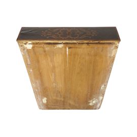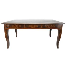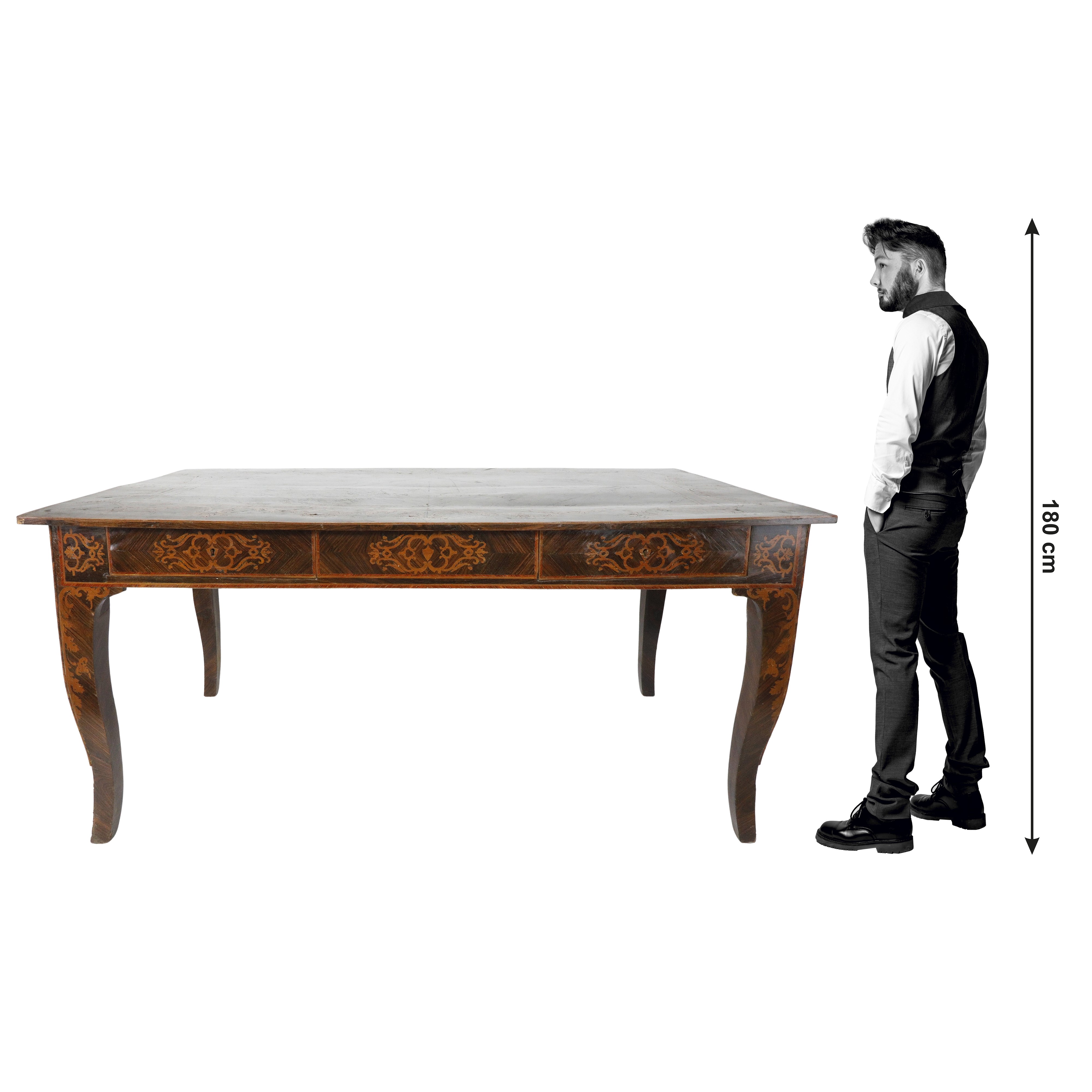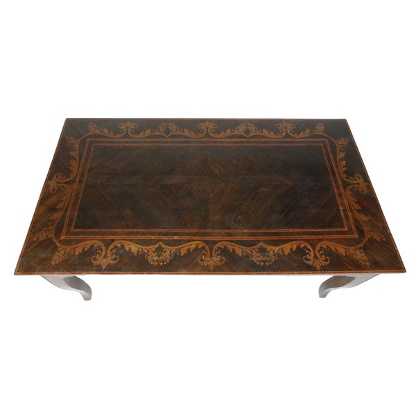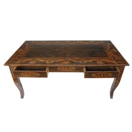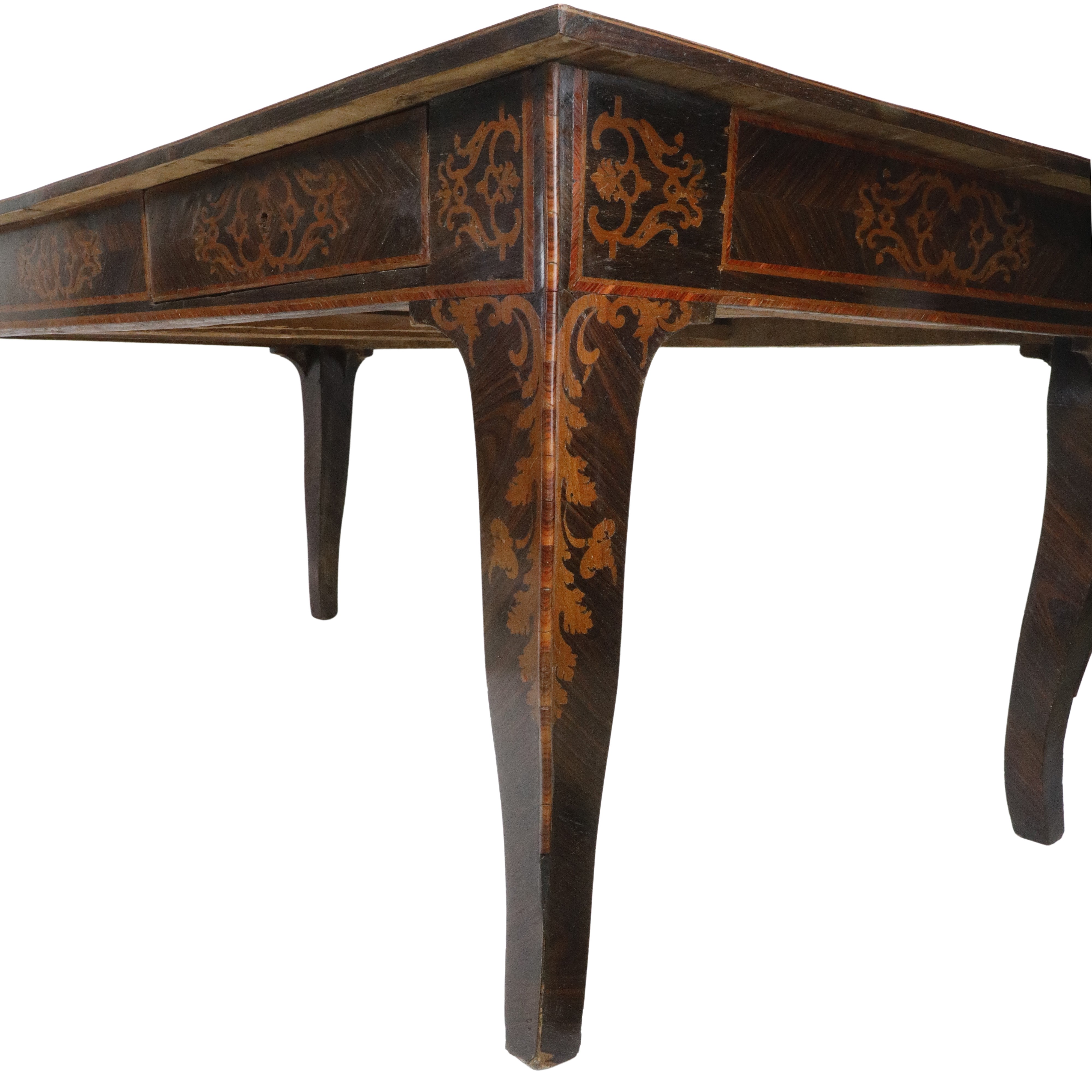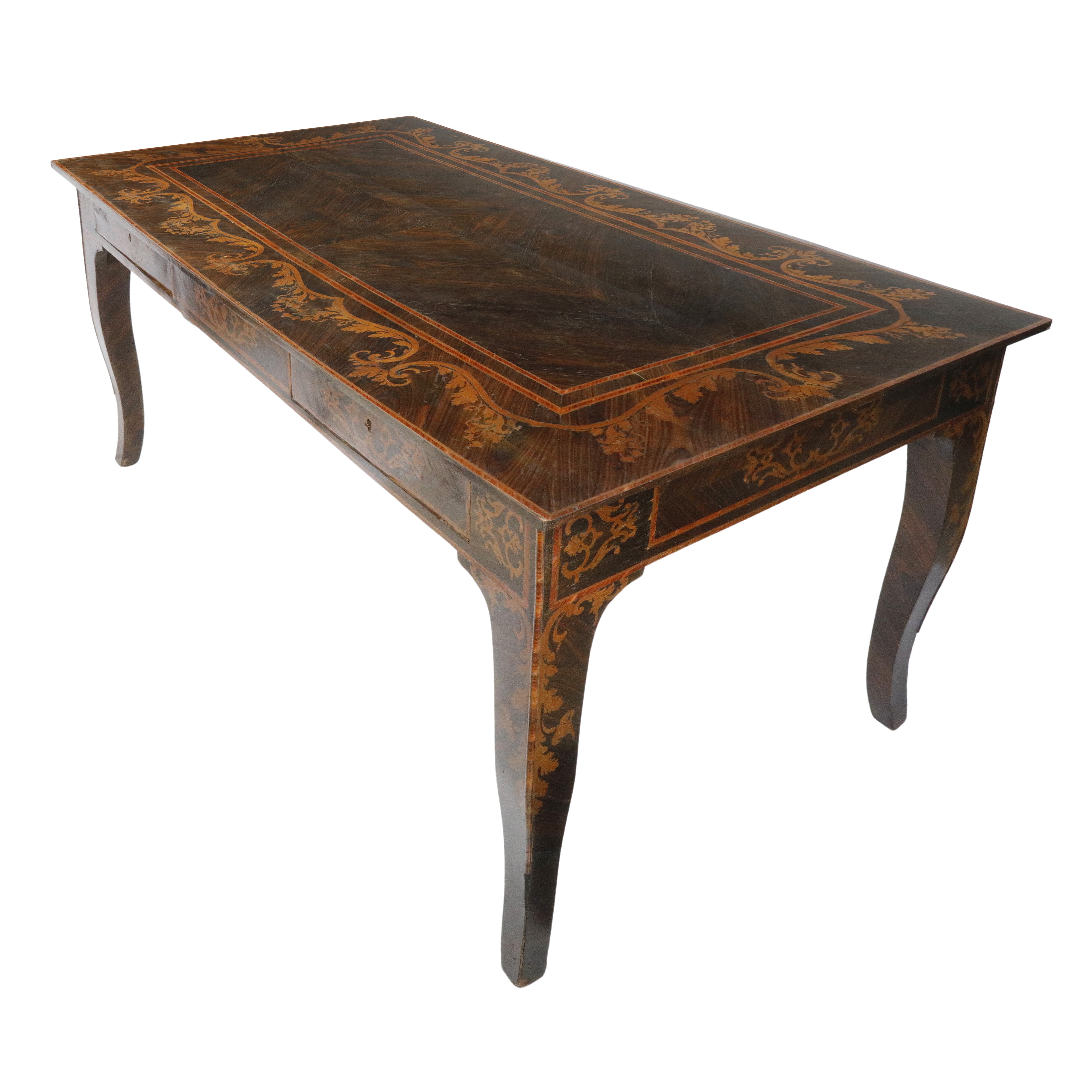 Tavolo scrivania lastronato a spina di pesce e riccamente intarsiato con racemi in acero e riquadri filettati in bois de rose. Gambe mosse nello stile Luigi Quindicesimo. Due cassetti integrati nella fascia sotto-piano con intarsi coordinati a quelli presenti su tutto il tavolo. Interni in legno di pioppo. (Presenti lievi difetti).