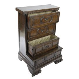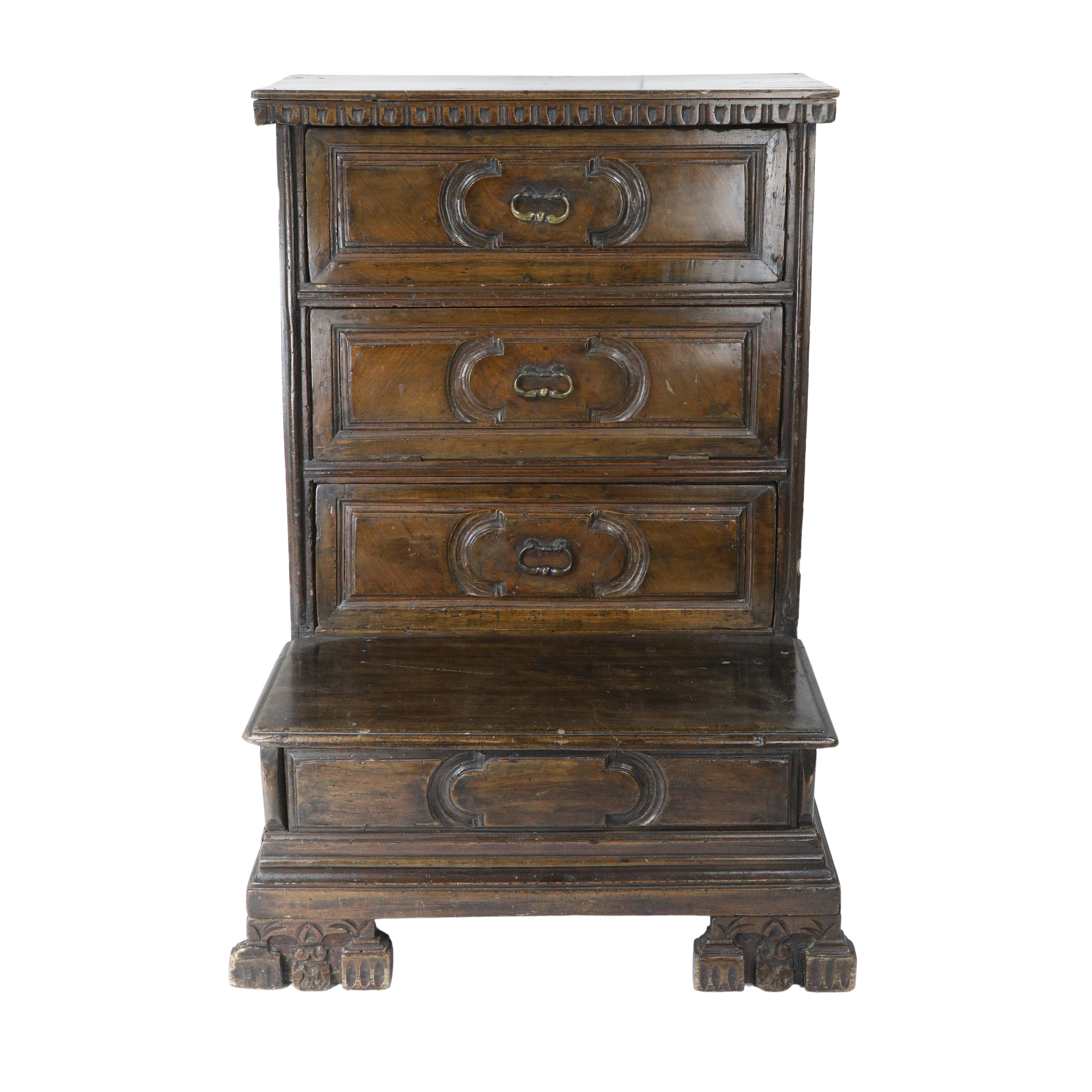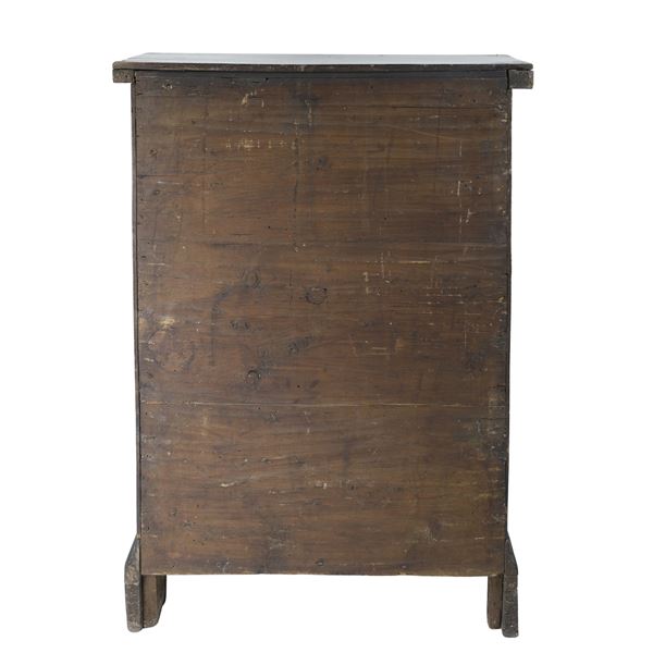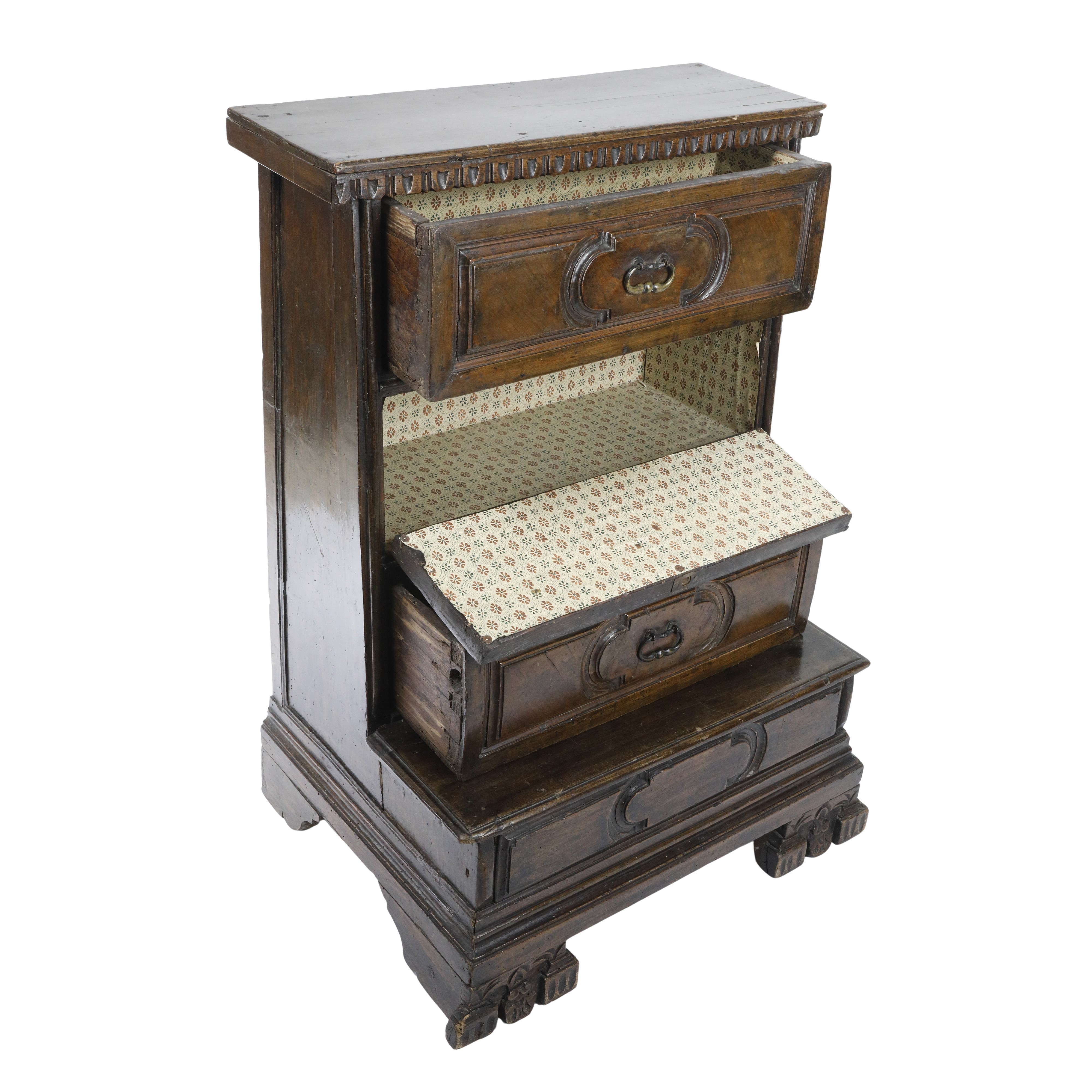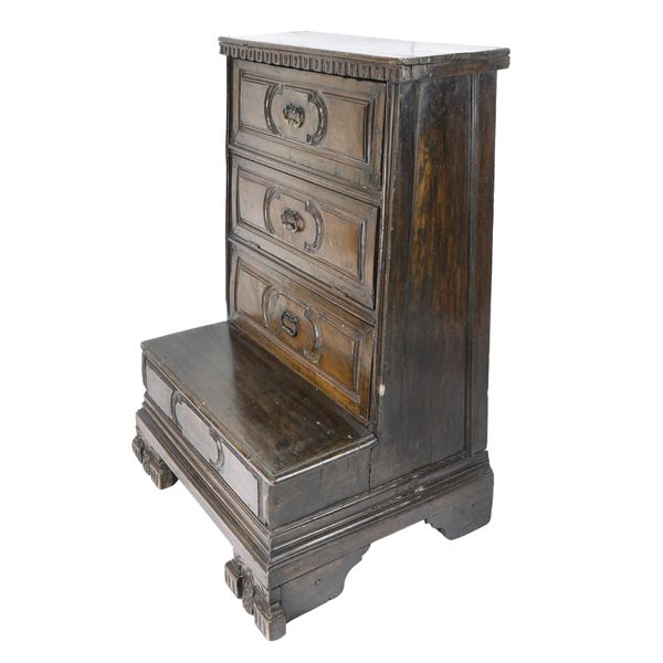Inginocchiatoio in noce a 3 cassetti di cui uno centrale a ribalta. Fronte sagomato a formelle incorniciate. Piano dentellato, piedi a mensola.