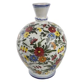 Fiasca in ceramica decorata, con collo a tromba e ansa a nastro