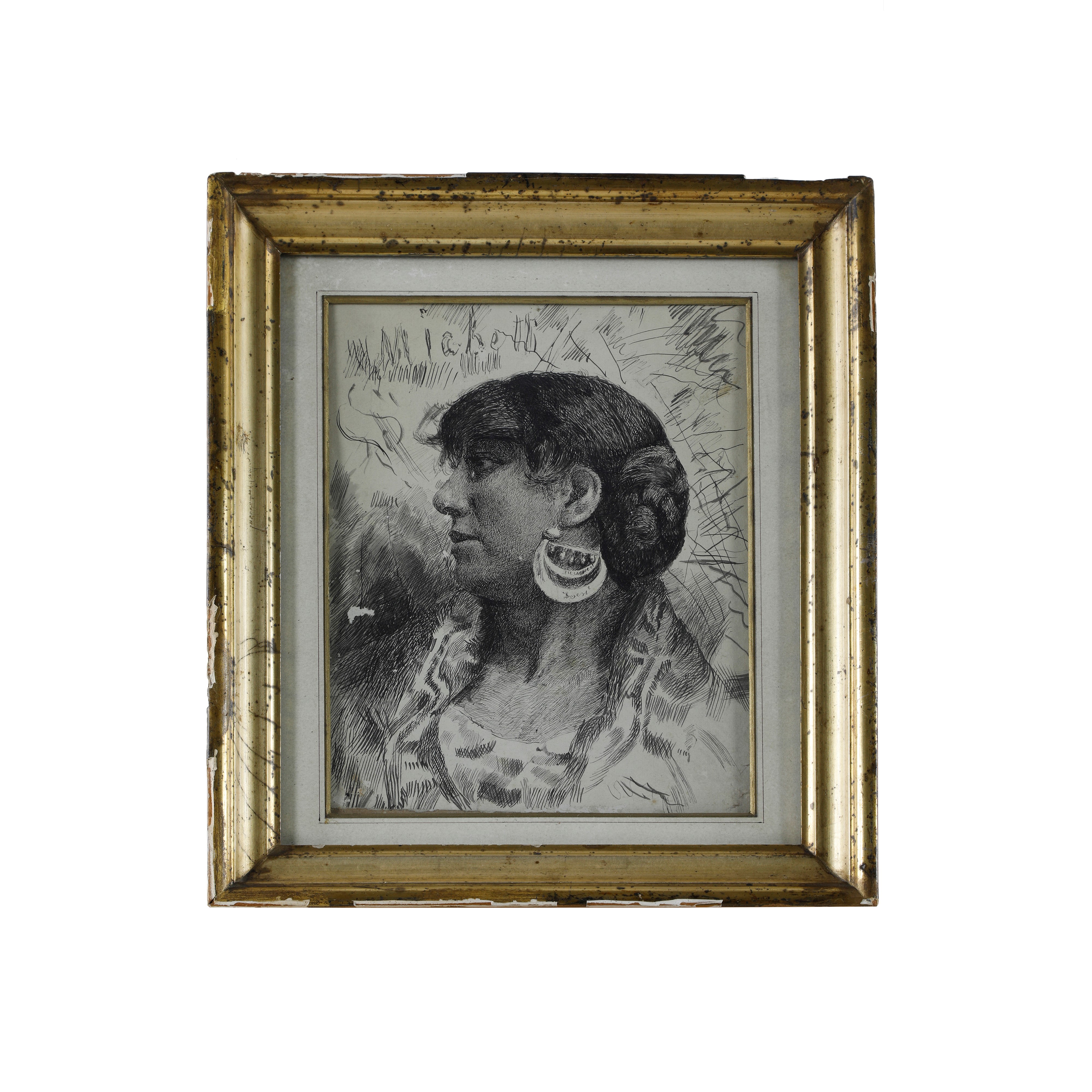 Tecnica mistaProfilo di donna abruzzese con "sciacquajje" realizzato a tecnica "china su carta" incollata su cartoncino pressato.