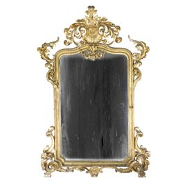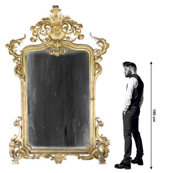 Monumentale specchiera intagliata e dorata a foglia oro, con cimasa gettante a forma di conchiglia e motivi fogliacei.