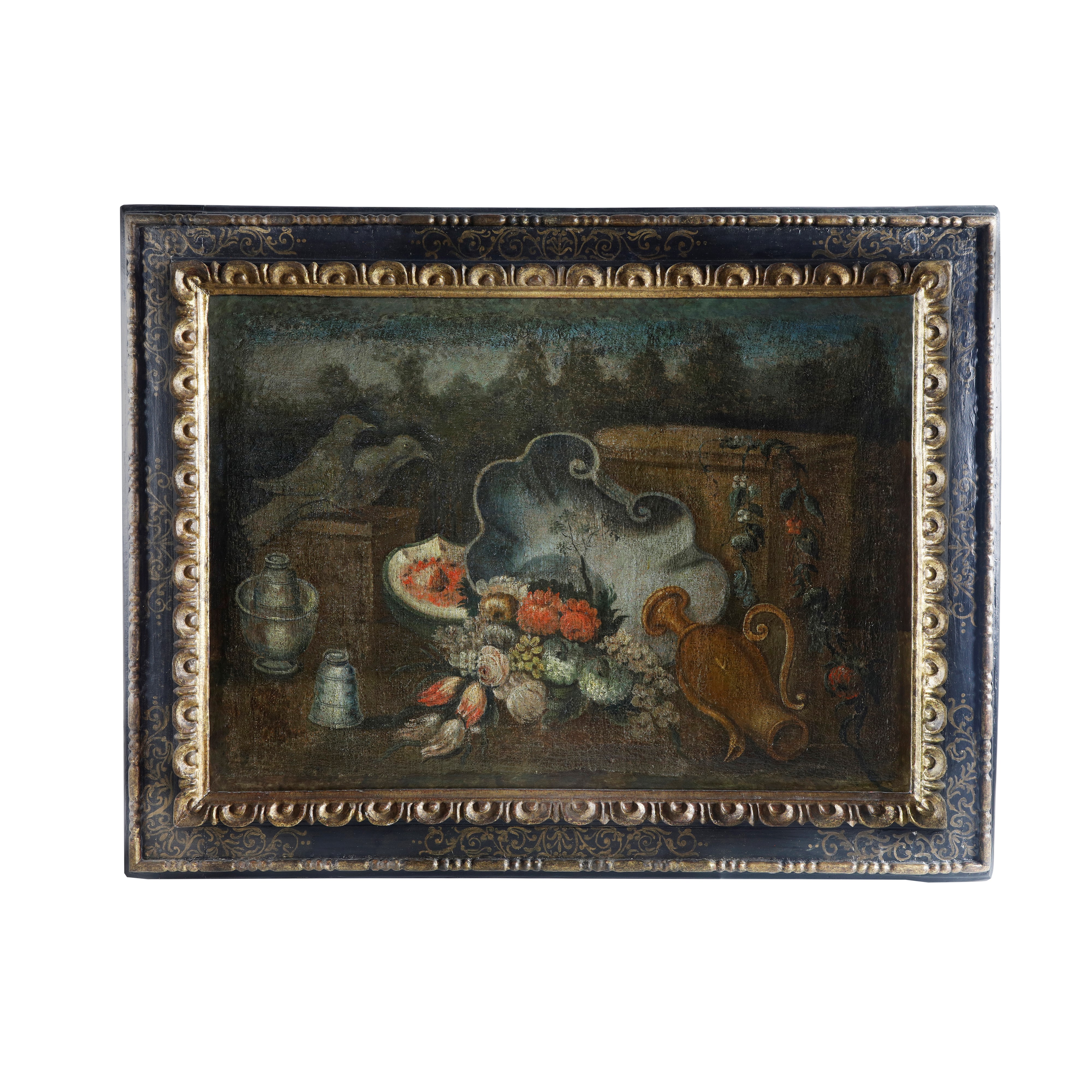 cm 63,7x88,5 (corice 86,2x111)Dipinto olio su tela raffigurante natura morta con vassoio a conchiglia, bouquet di fiori e anguria su sfondo architettonico.