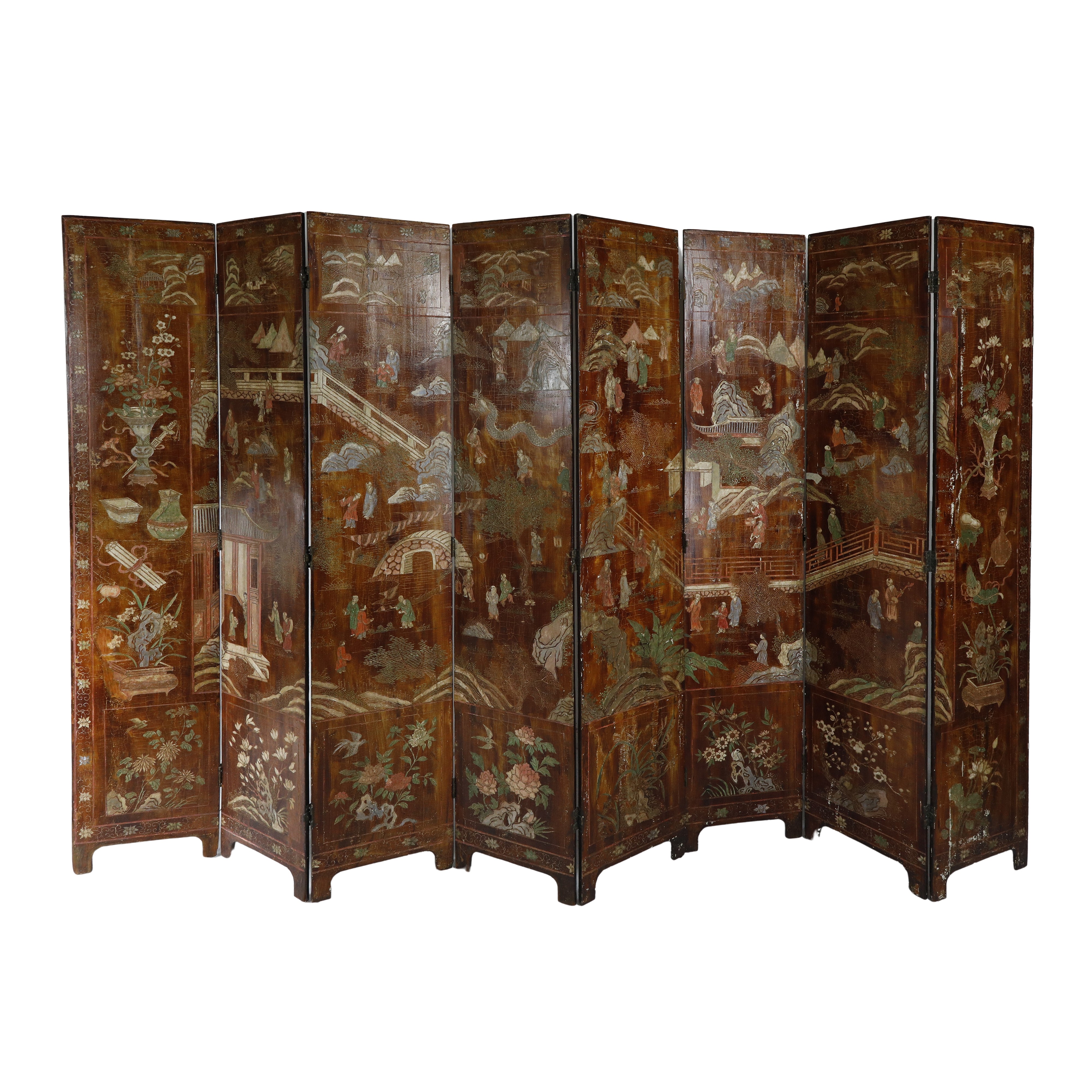 Decorato su entrambi i lati da paesaggi animati da personaggi a composizioni floreali intagliati e laccati in policromia su fondo marrone.