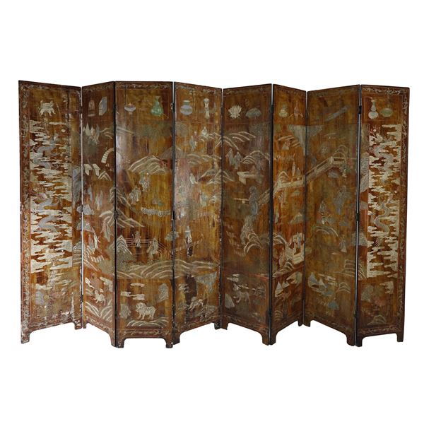 Paravento a otto ante in legno e lacca di Coromandel - Cina