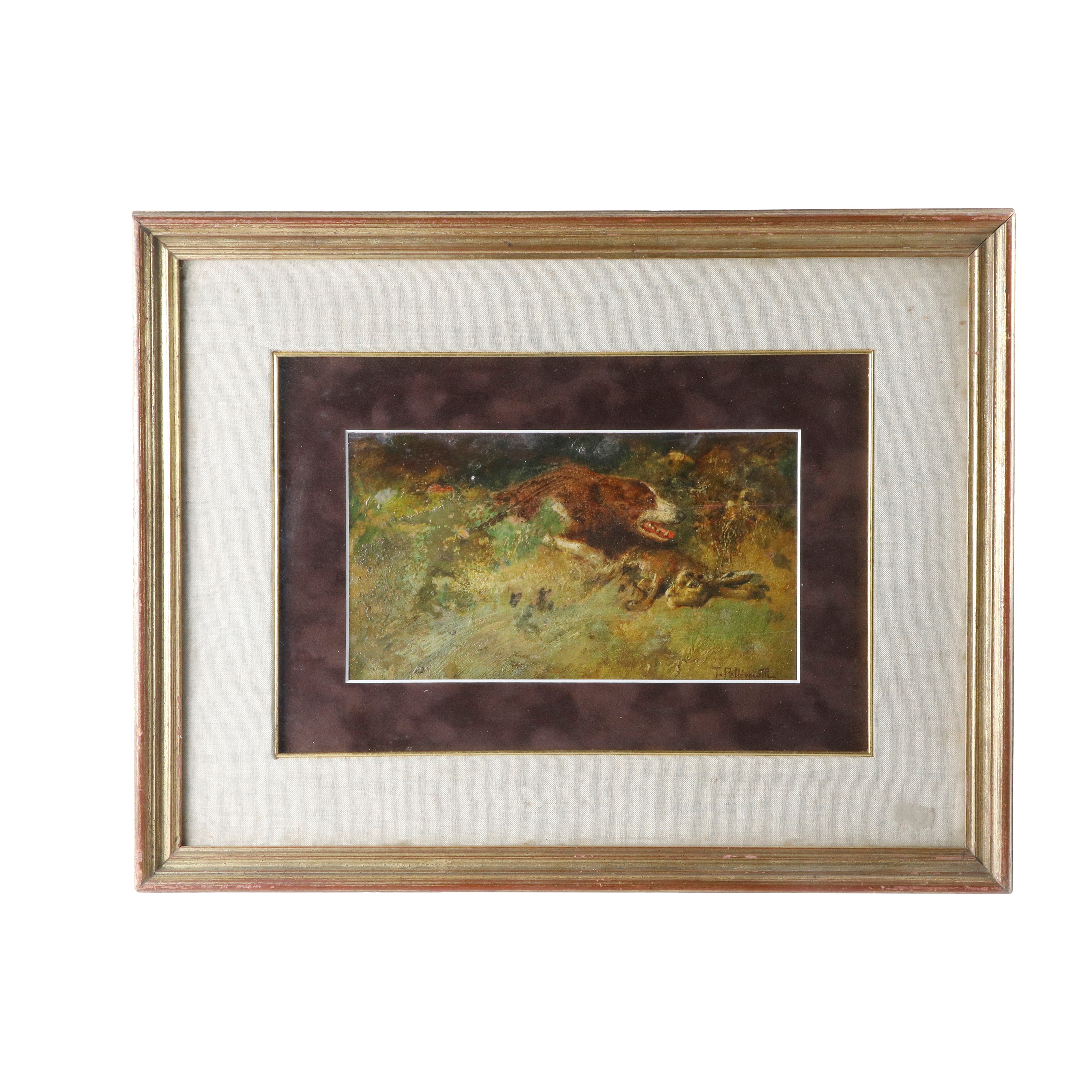 Olio su TelaDipinto olio su tavola raffigurante "Cane con lepre"