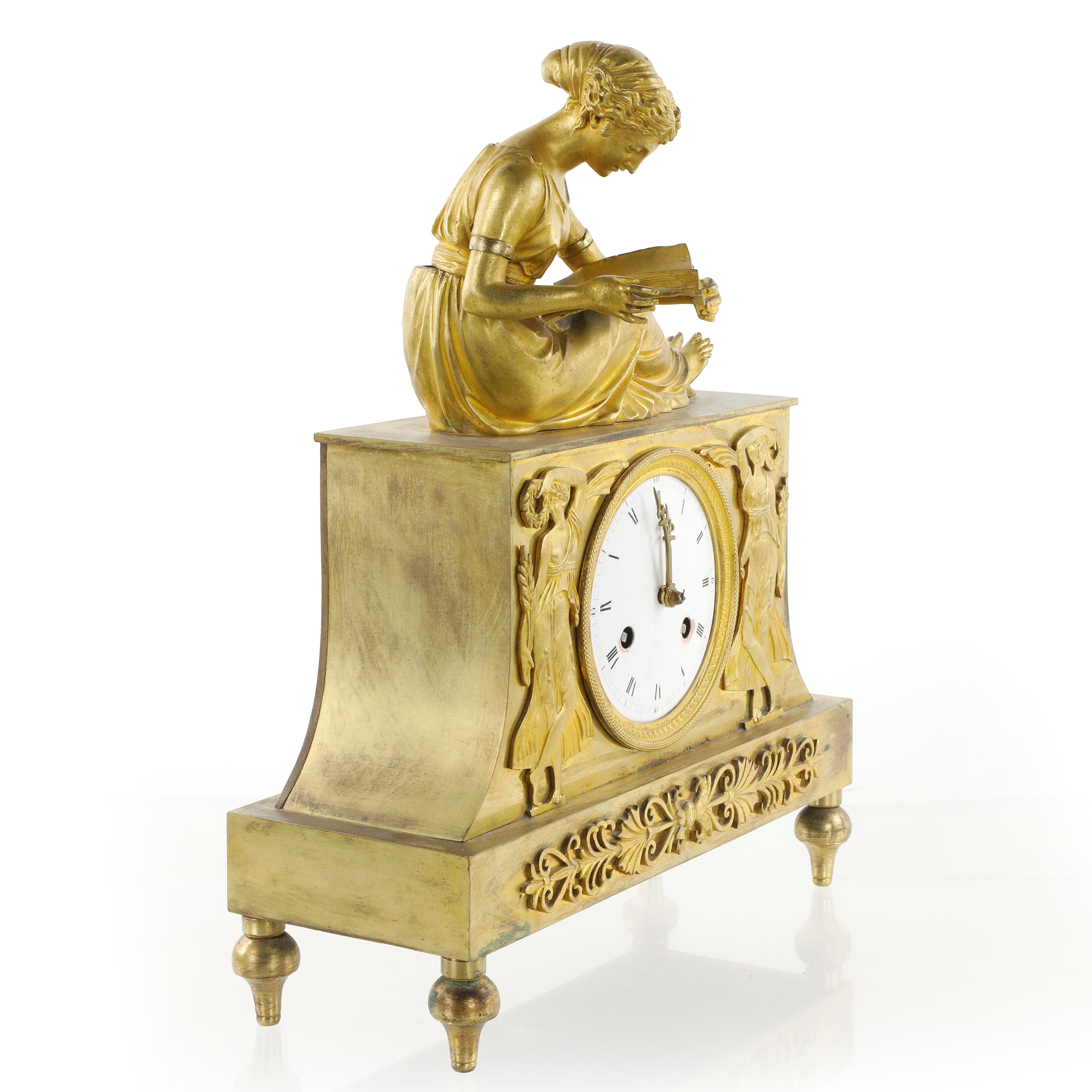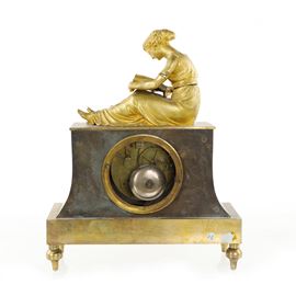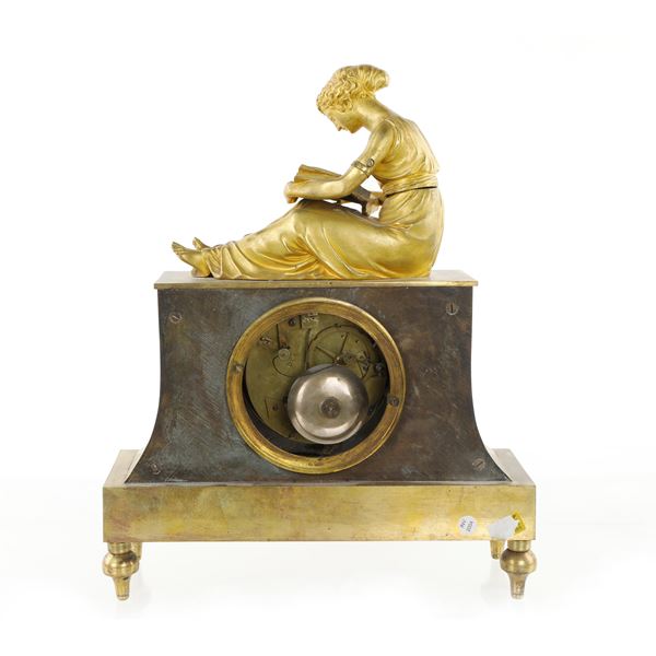 Pendola in bronzo dorato sormontata da scultura di figura femminile intenta a leggere.