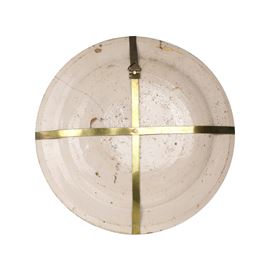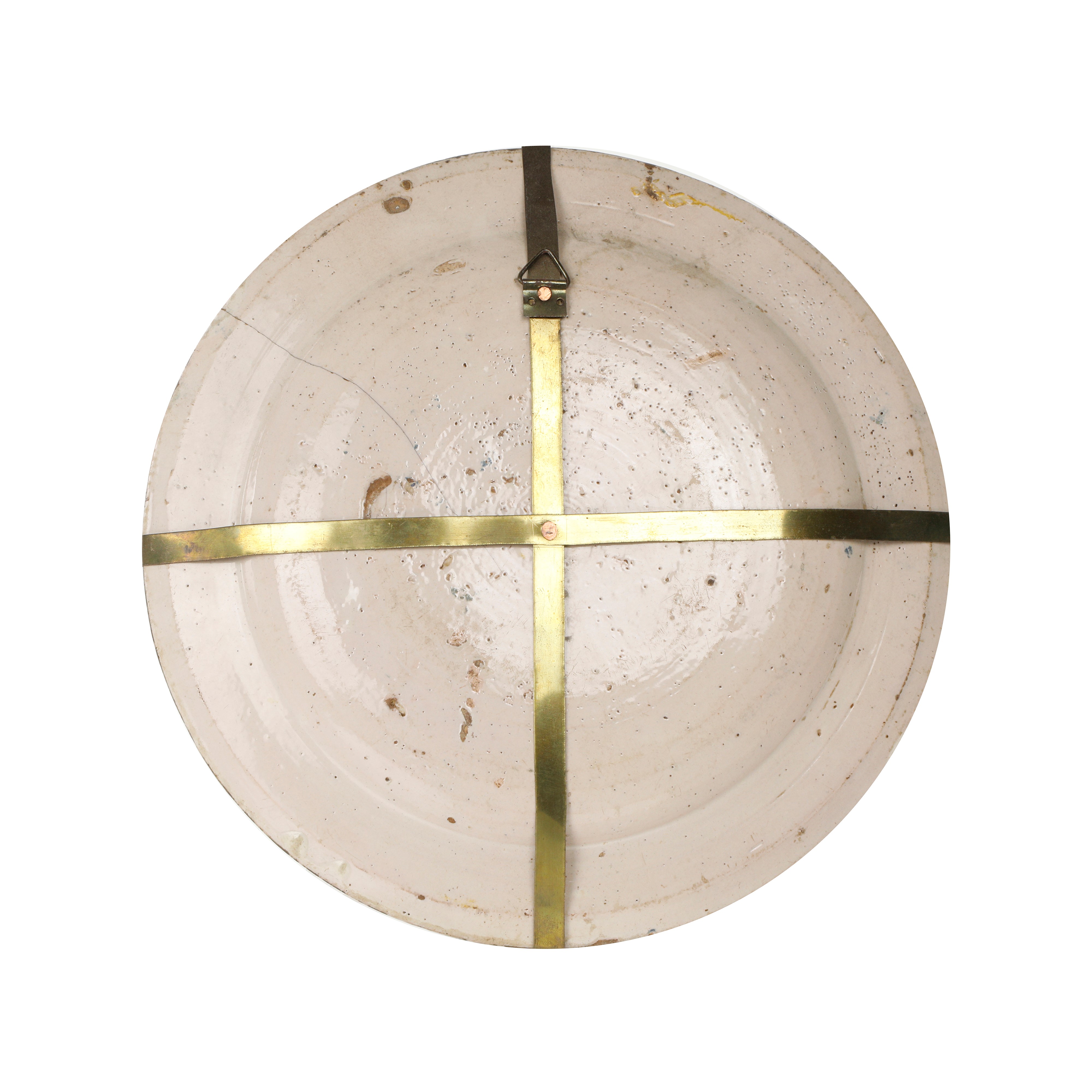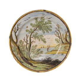 Piatto in ceramica Castelli, raffigurante paesaggio con alberi e barche sullo sfondo