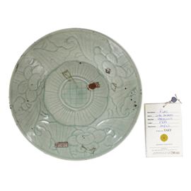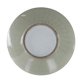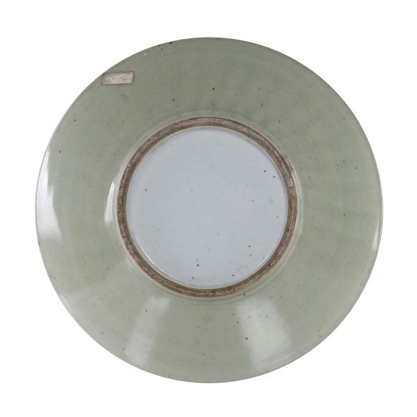 Piatto in porcellana Celadon a decoro naturalistico, Cina, dinastia Qing.