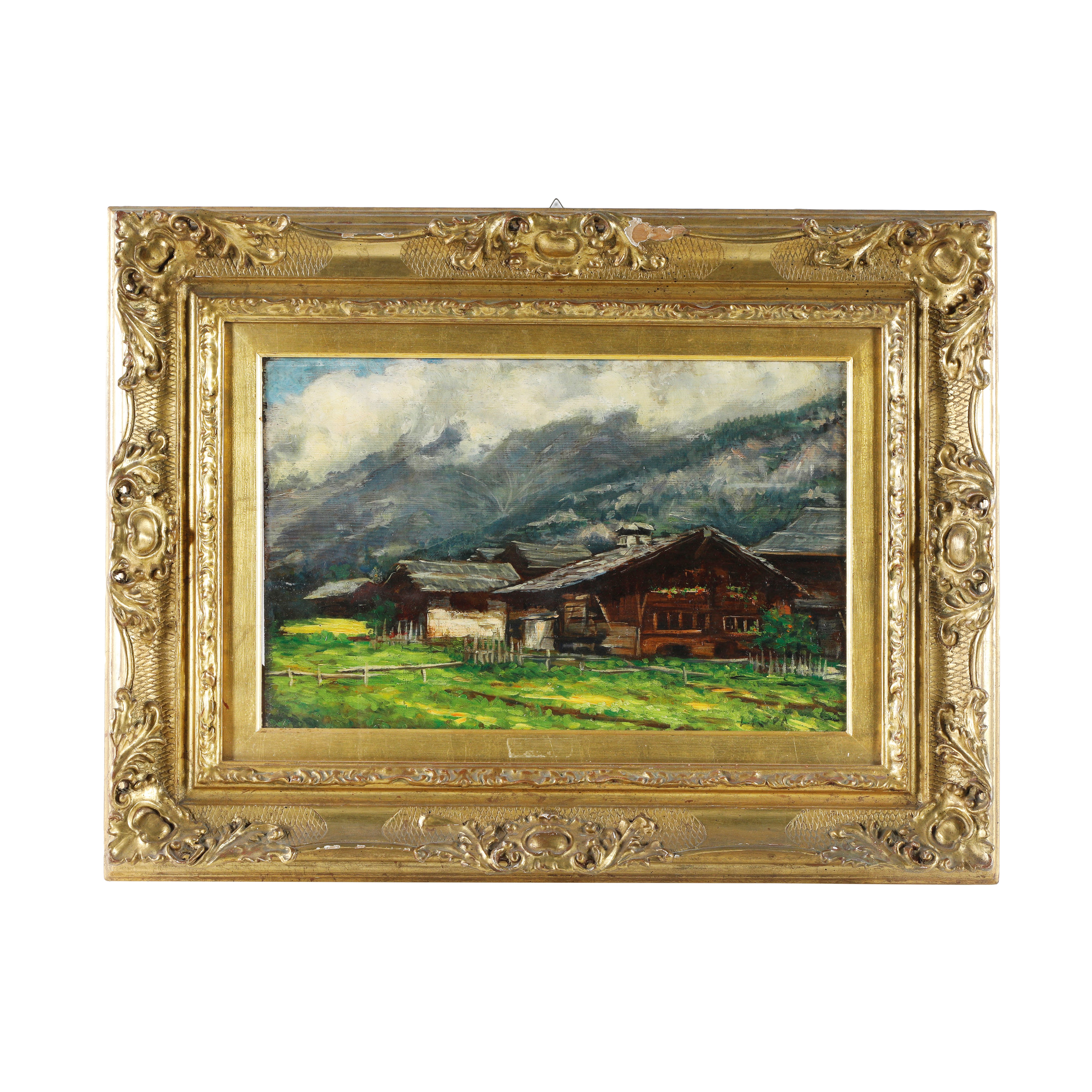 Olio su tavolaDipinto olio su tavola, raffigurante paessagio montano con baite.