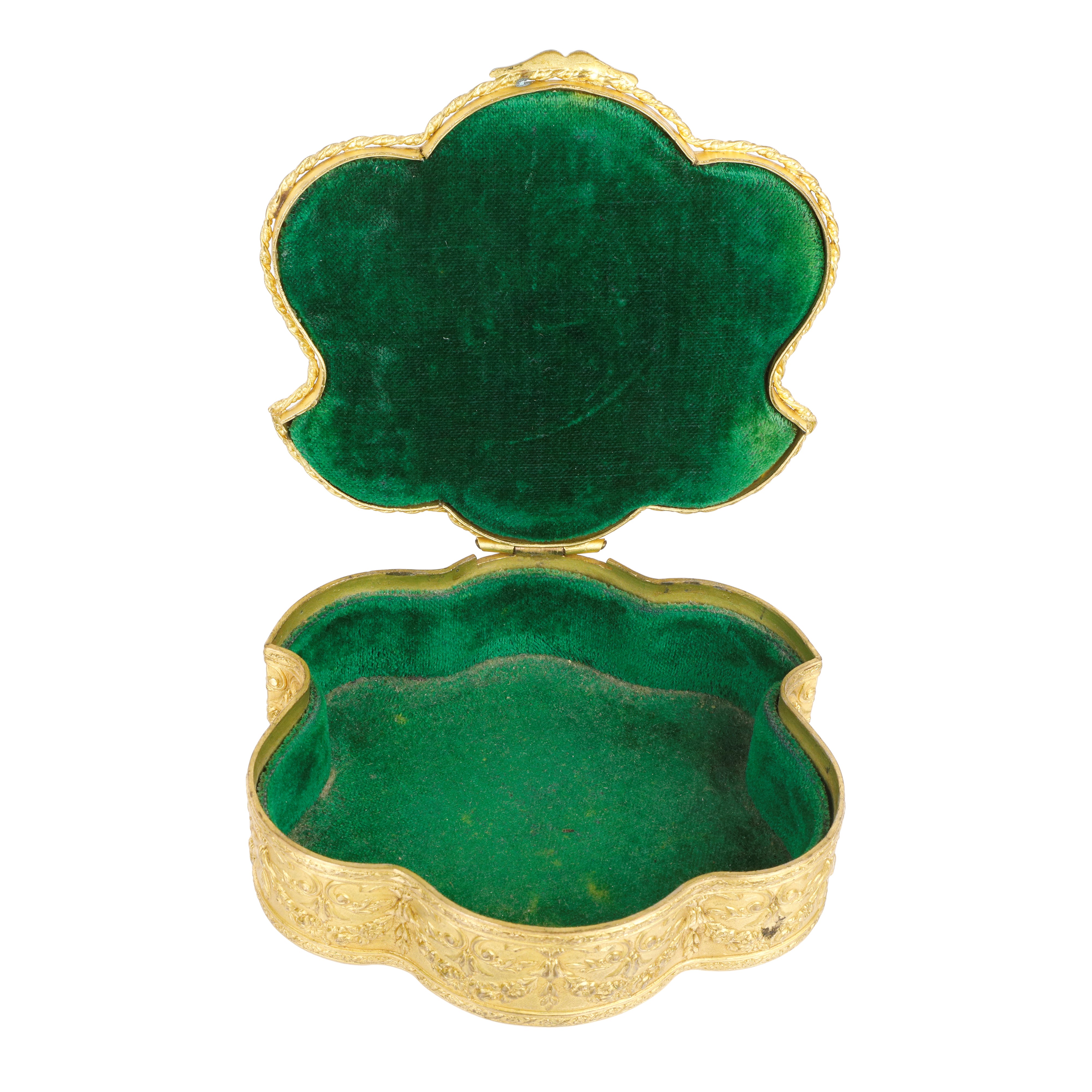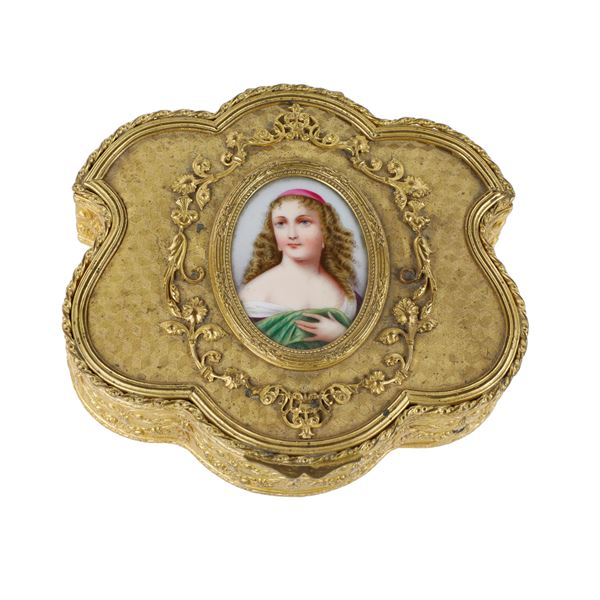 Scatola portagioie dalla sagoma polilobata in metallo dorato. Il coperchio presenta al centro una placca ovale in porcellana decorata in policromia a raffigurare effige femminile. Superficie ornata di elementi a volute di foglie, ghirlande fiorite e motivo a nastro ritorto.