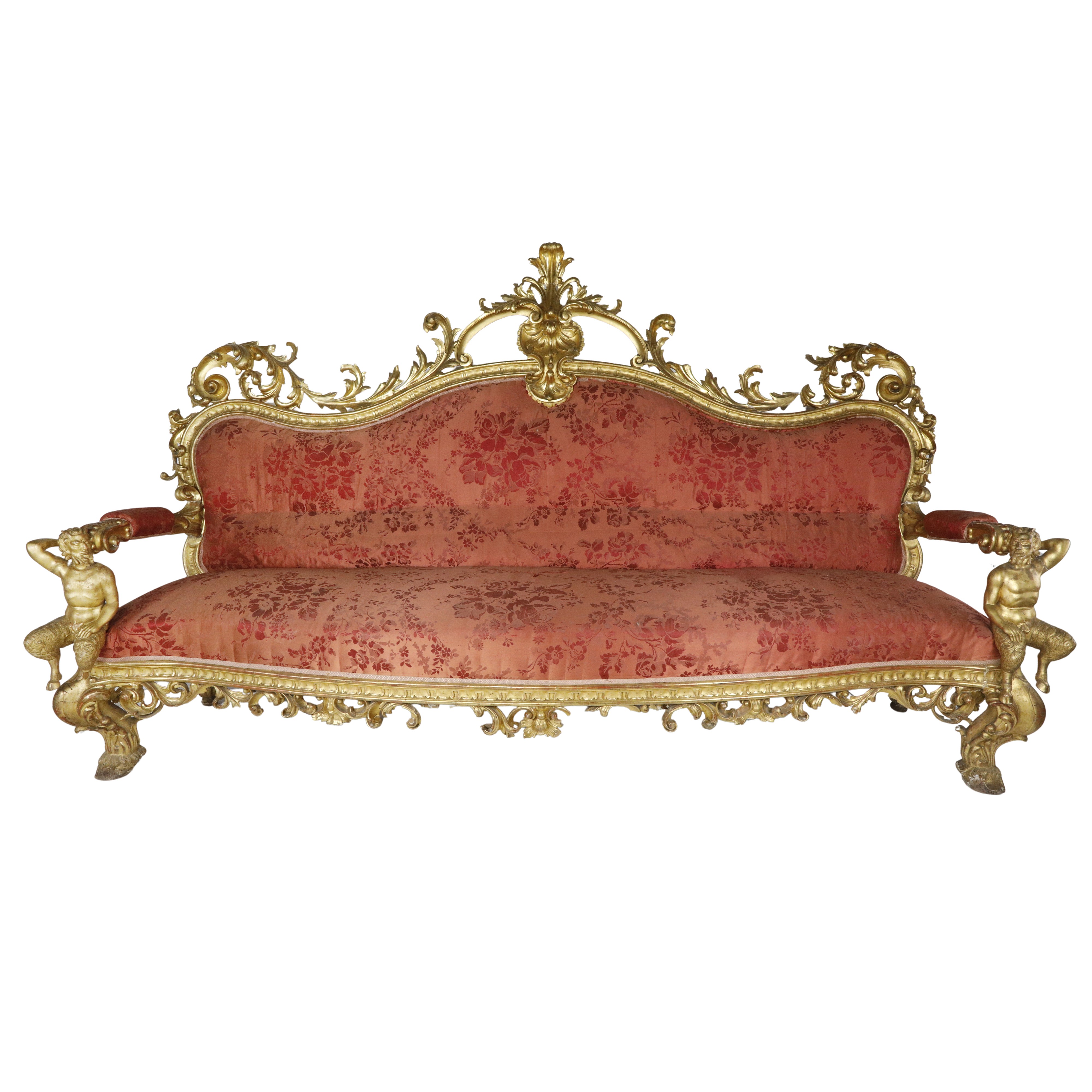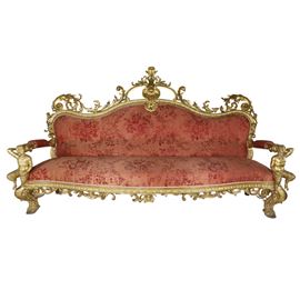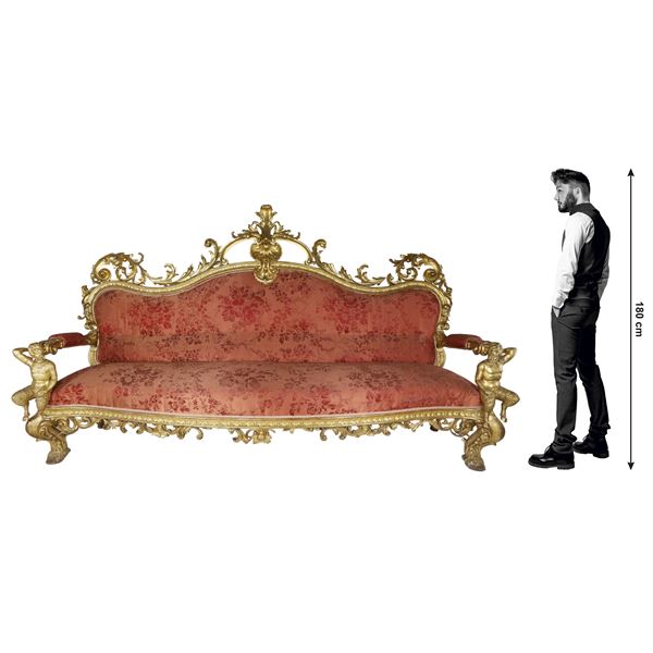 Scenografico e grande divano intagliato e dorato, Napoli, metà XIX secolo, caratterizzato da un'elaborata decorazione intagliata e dorata.
