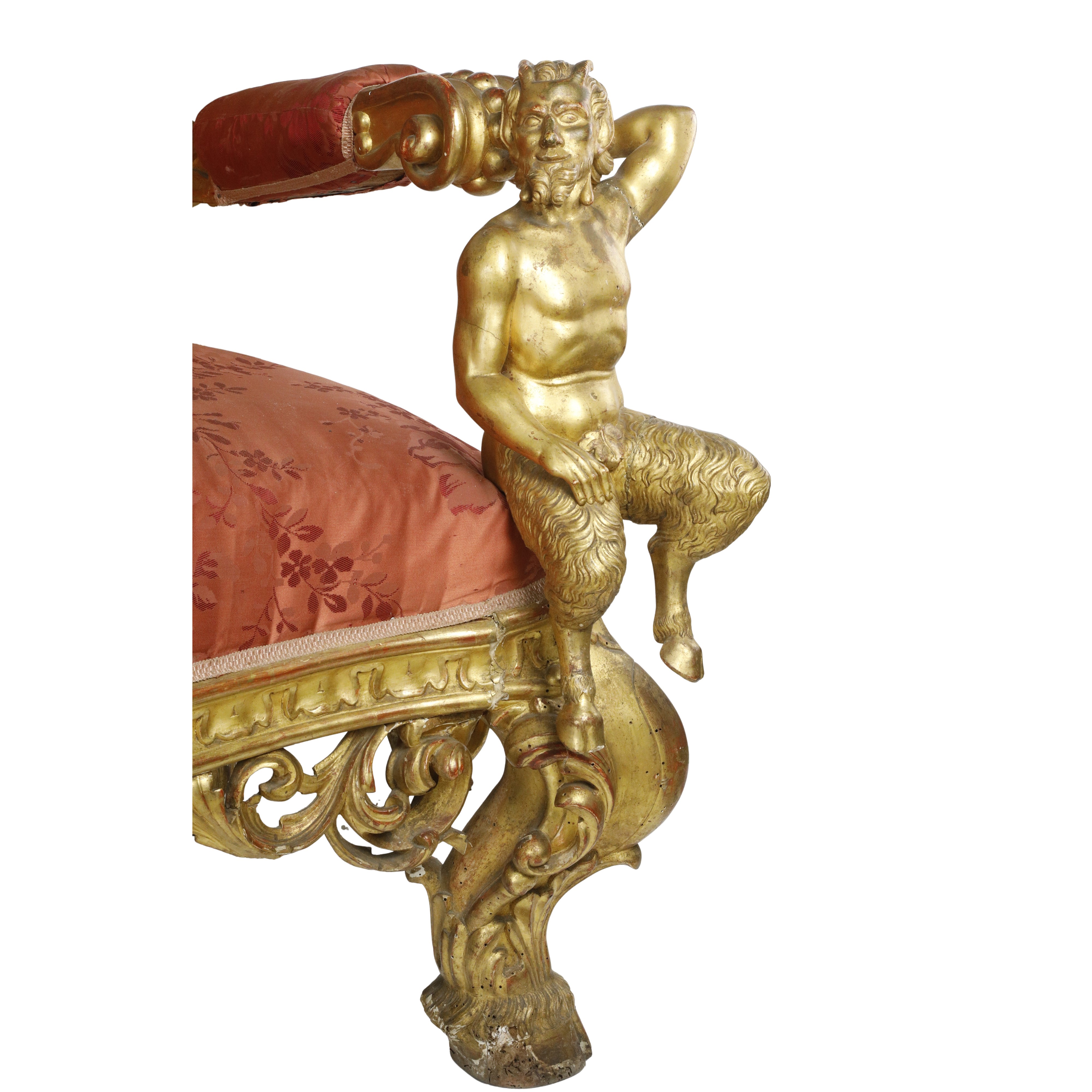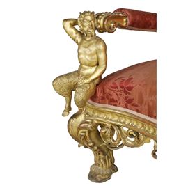 Braccioli costituiti da figure di satiri scolpiti a tutto tondo e dorati, queste figure mitologiche con zampe caprine e busto umano, fungono da raccordo tra la seduta e i braccioli imbottiti.