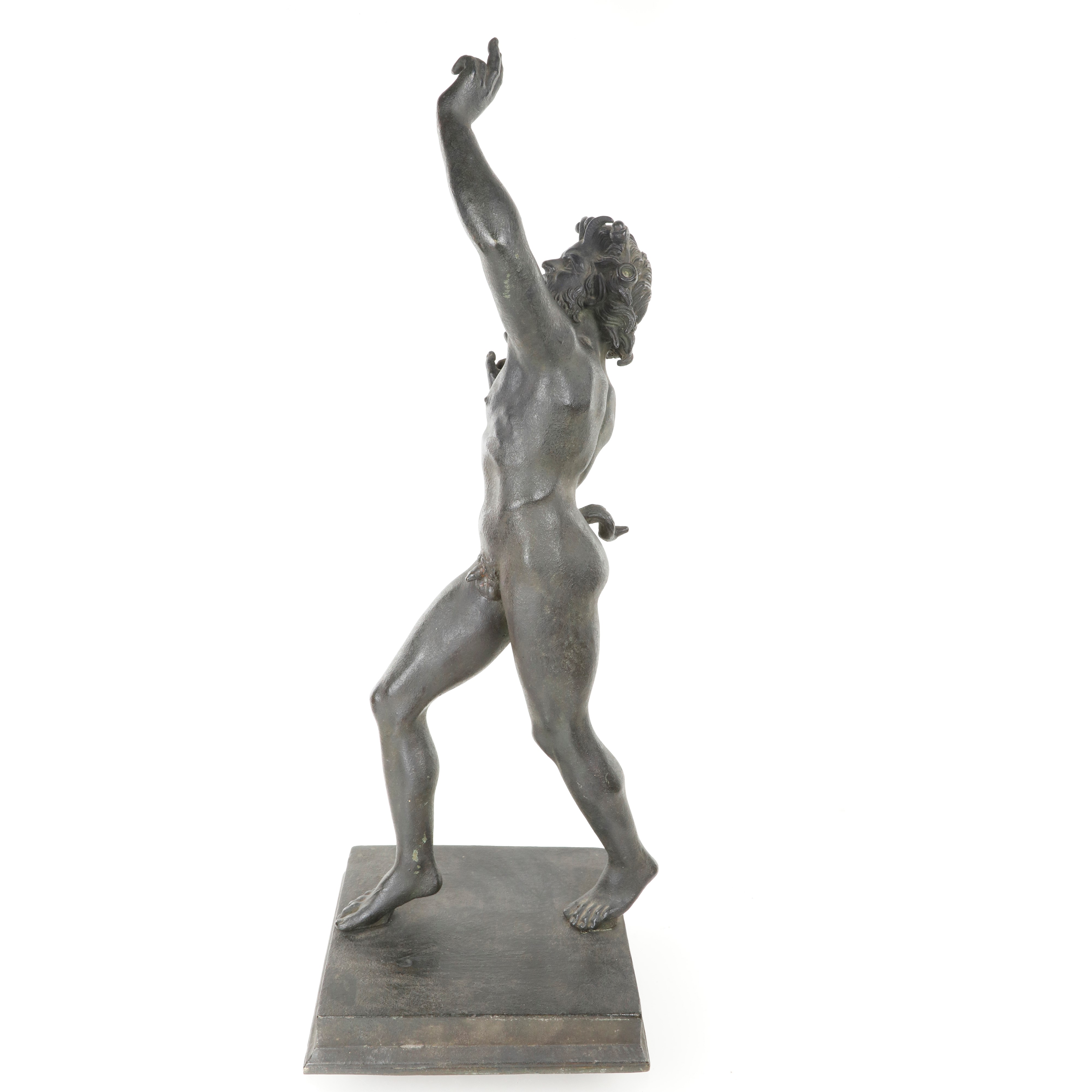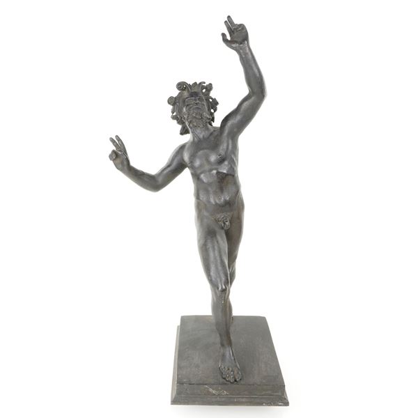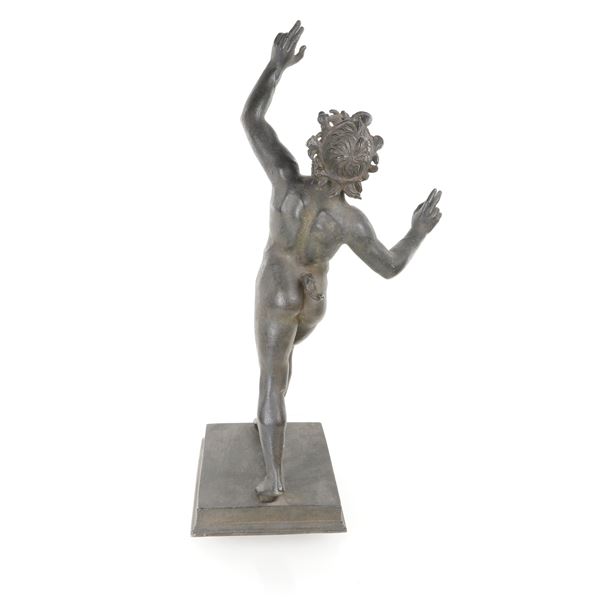 Scultura in bronzo raffigurante Fauno con braccia sollevate.
