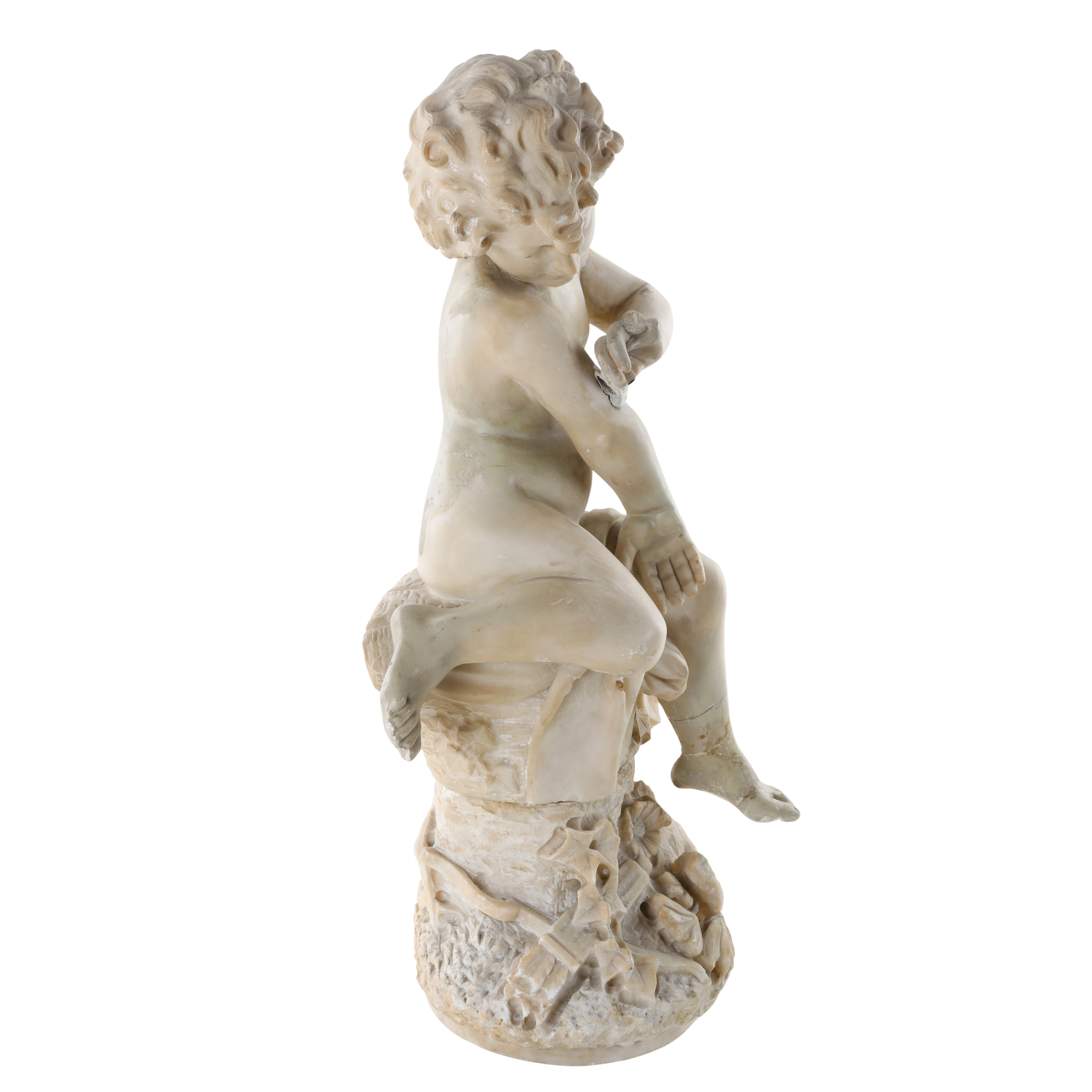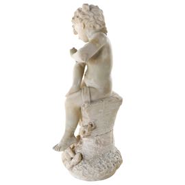 Scultura in alabastro raffigurante Cupido con una farfalla, seduto su una roccia con arco e freccia a terra.