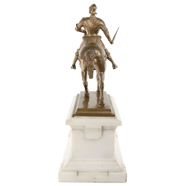 Scultura in bronzo raffigurante "Soldato a cavallo" su basamento in marmo bianco