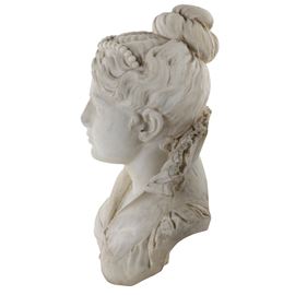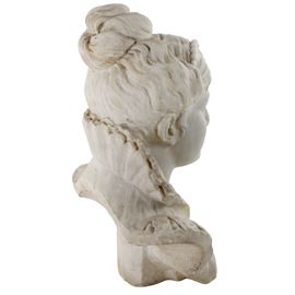 Scultura in marmo bianco raffigurante mezzobusto di nobildonna, con acconciatura impreziosita da filo di perle.