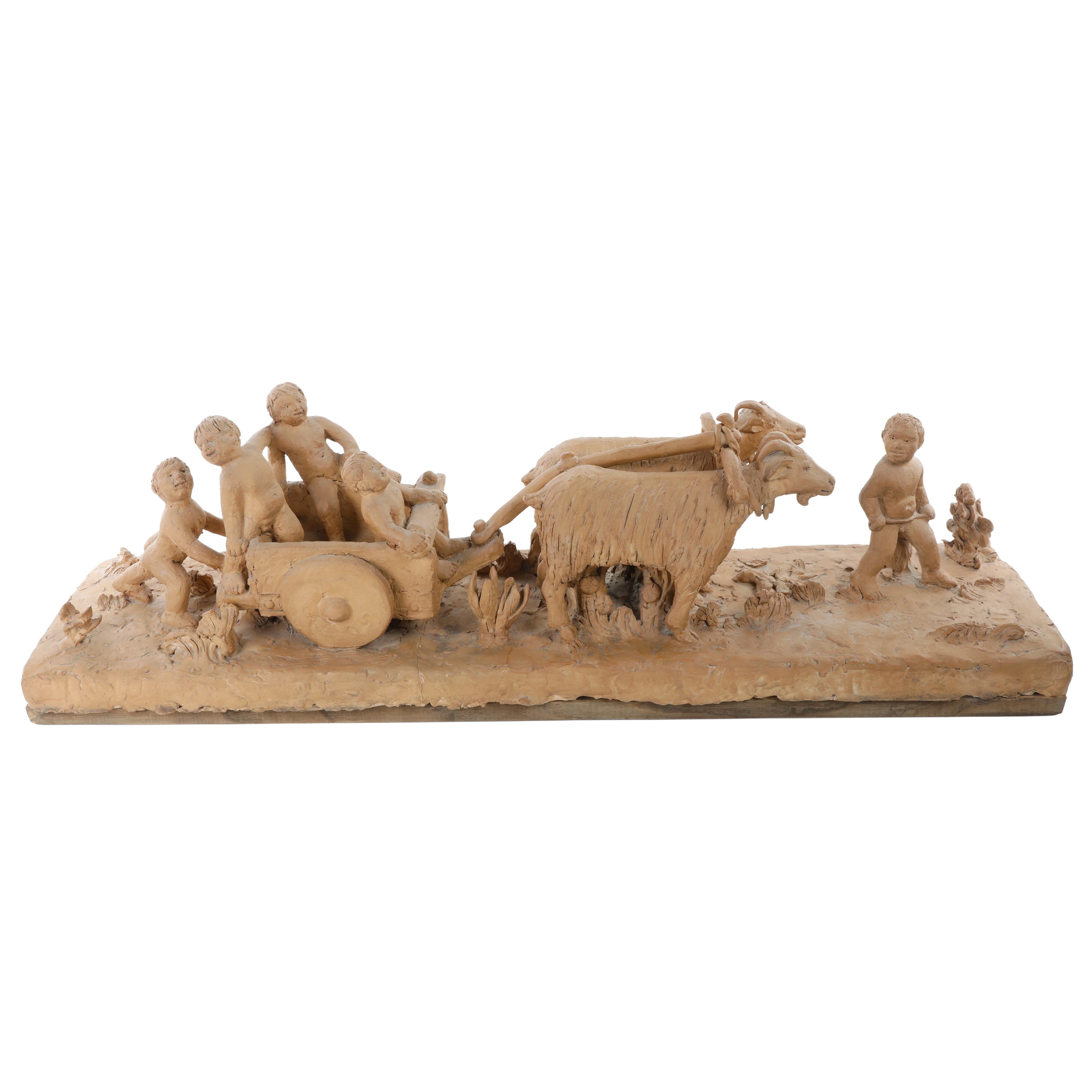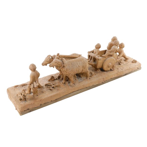 Scultura in terracotta raffigurante gioco di bambini su un carro trainato da capre.