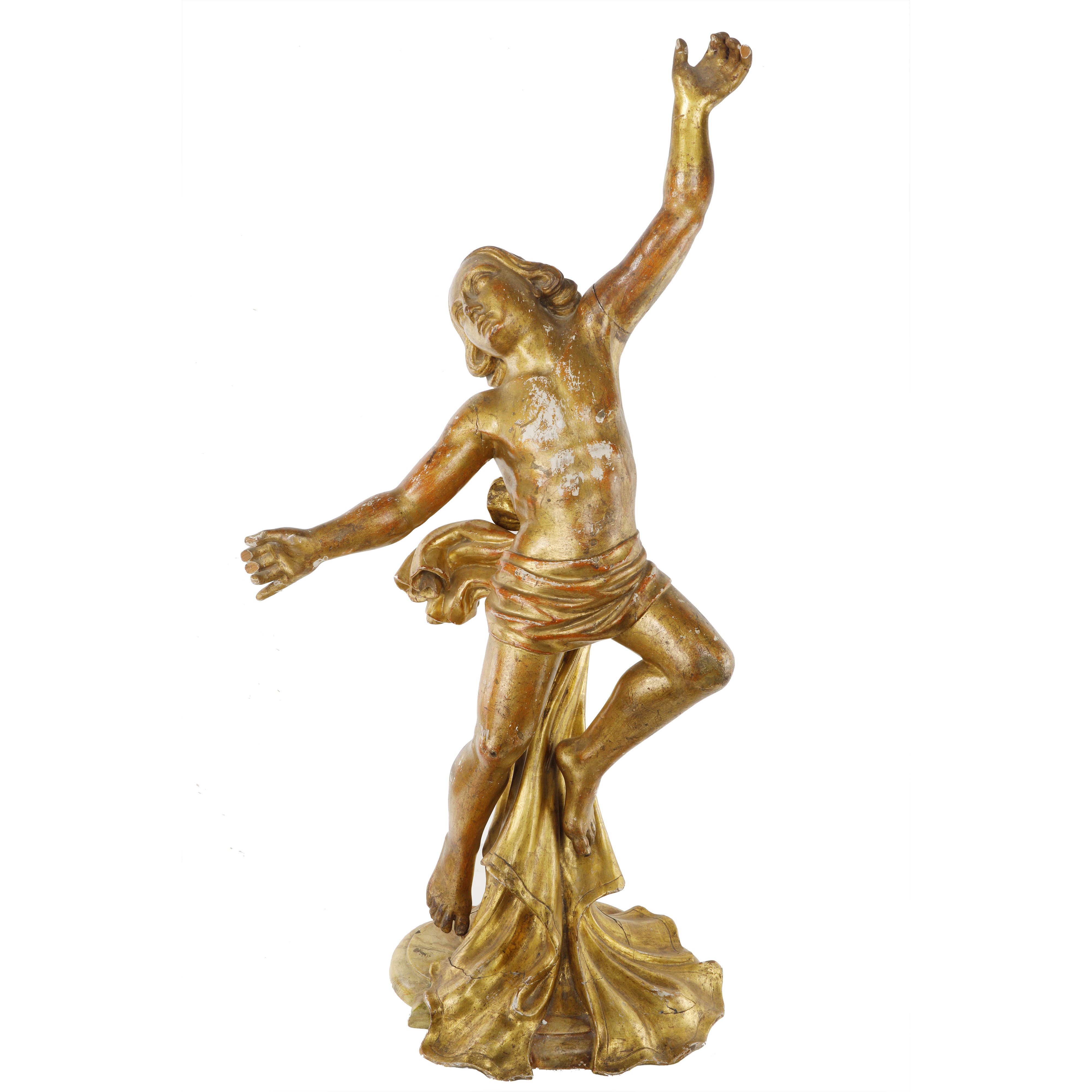 Scultura maschile adorante in legno intagliata e dorata a foglia oro con drappo.