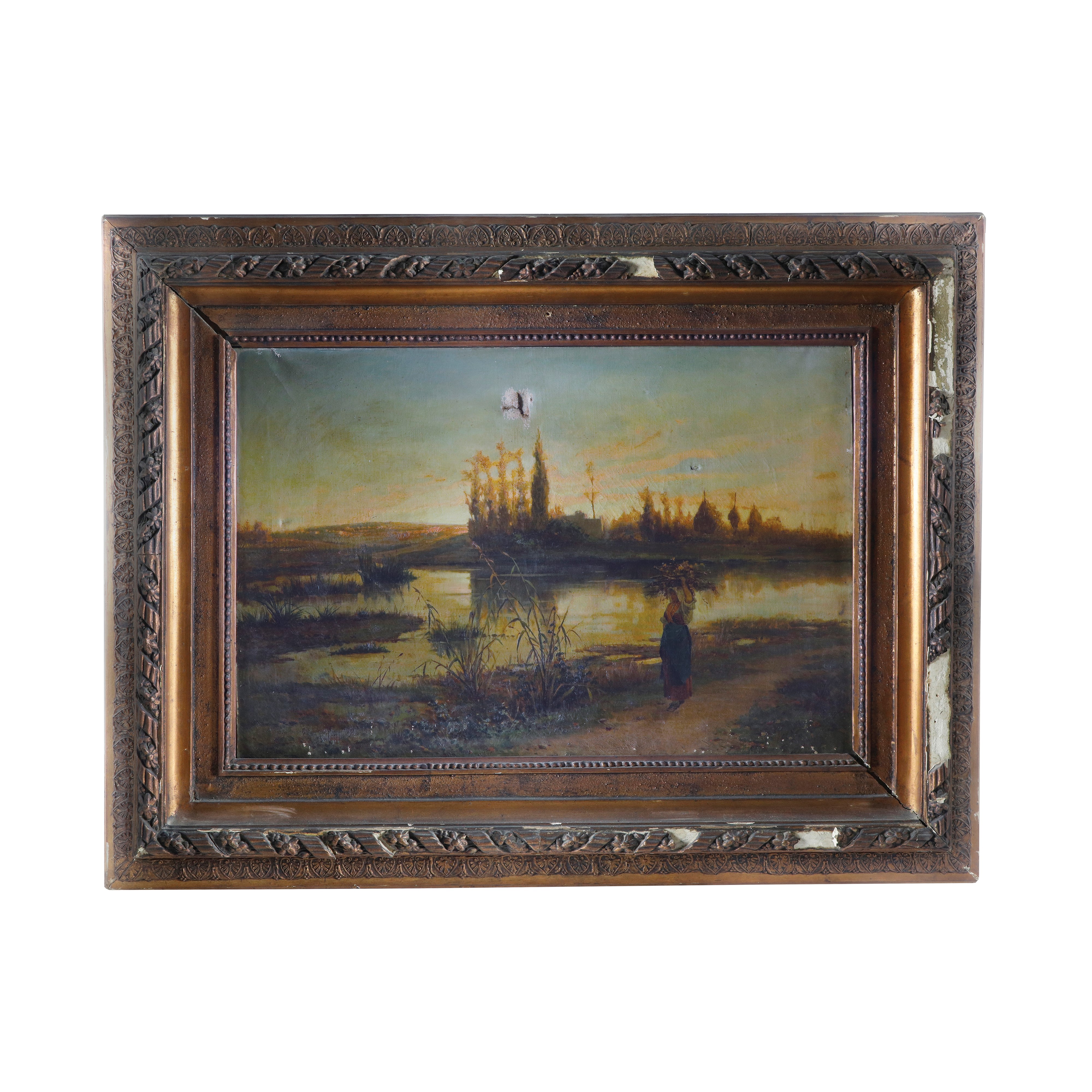 Dipinto olio su tela raffigurante "Paesaggio fluviale con pastorella".