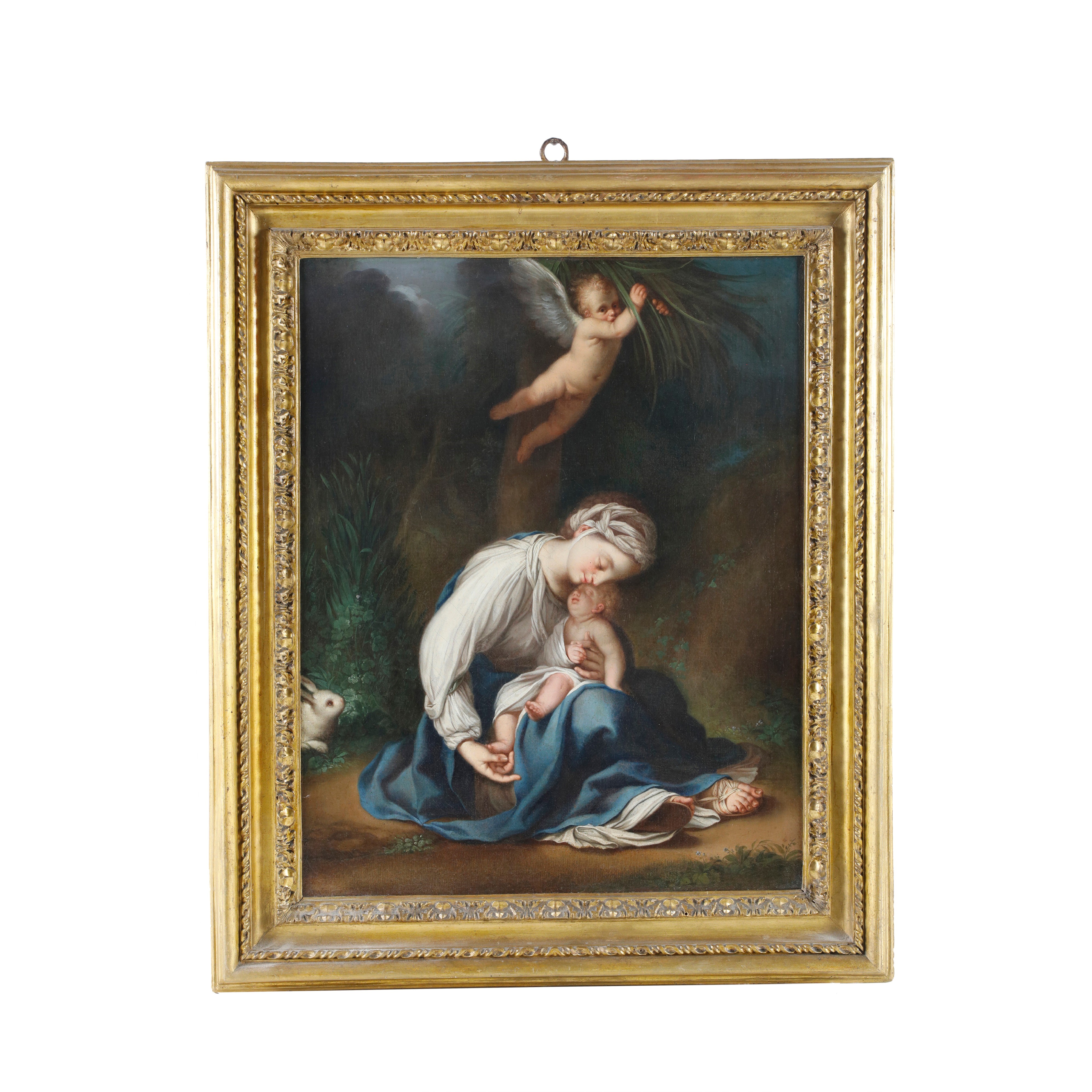 Dipinto Olio su tela, raffigurante Madonna con il Bambino durante la fuga in Egitto.