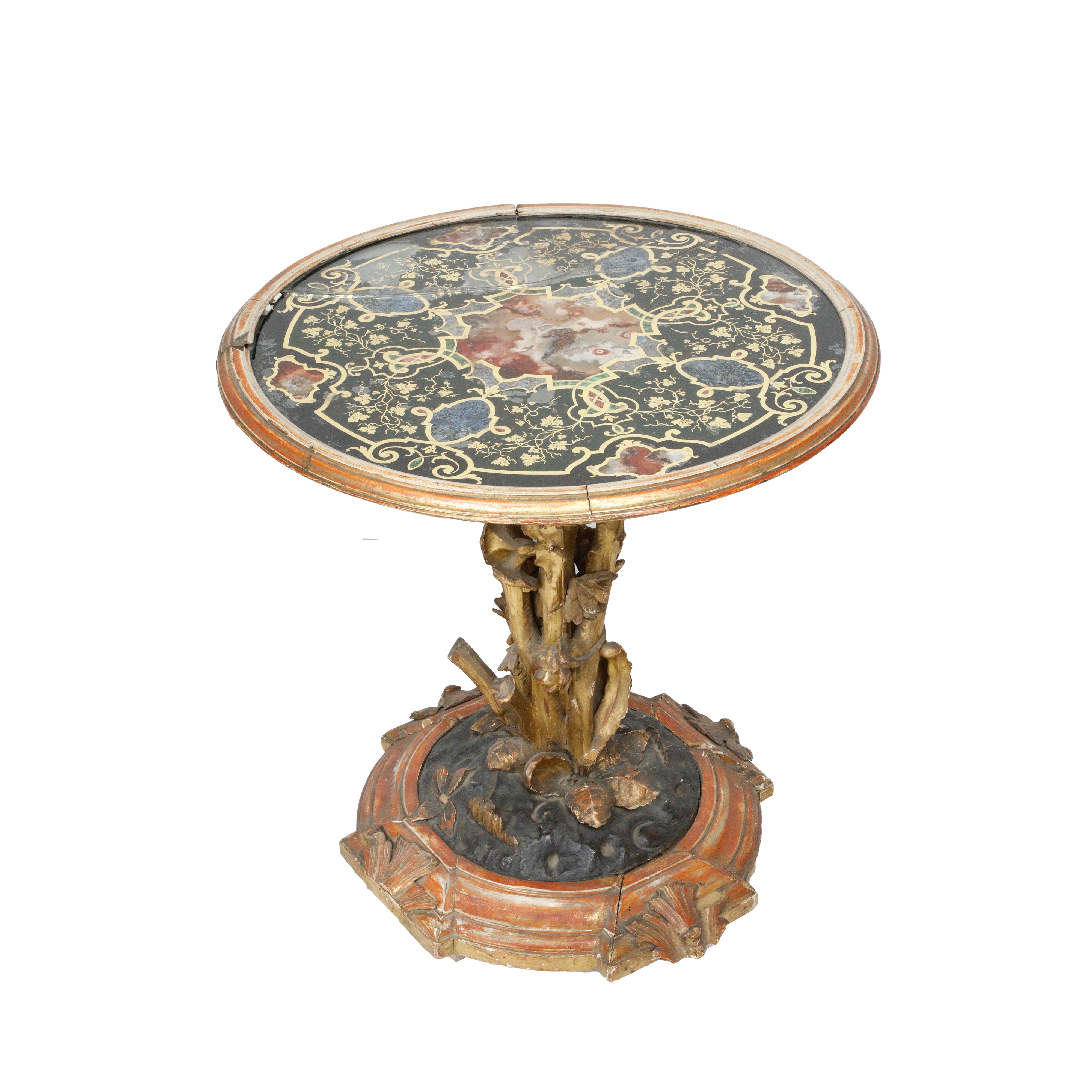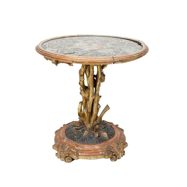 Tavolo da Centro rotondo in legno finemente intagliato e dorato, base a forma di roccia con fusto centrale con motivi naturalistici di fiori, foglie e rami che sorregge piano dipinto sottovetro e incorniciato con modanatura in legno dorato
