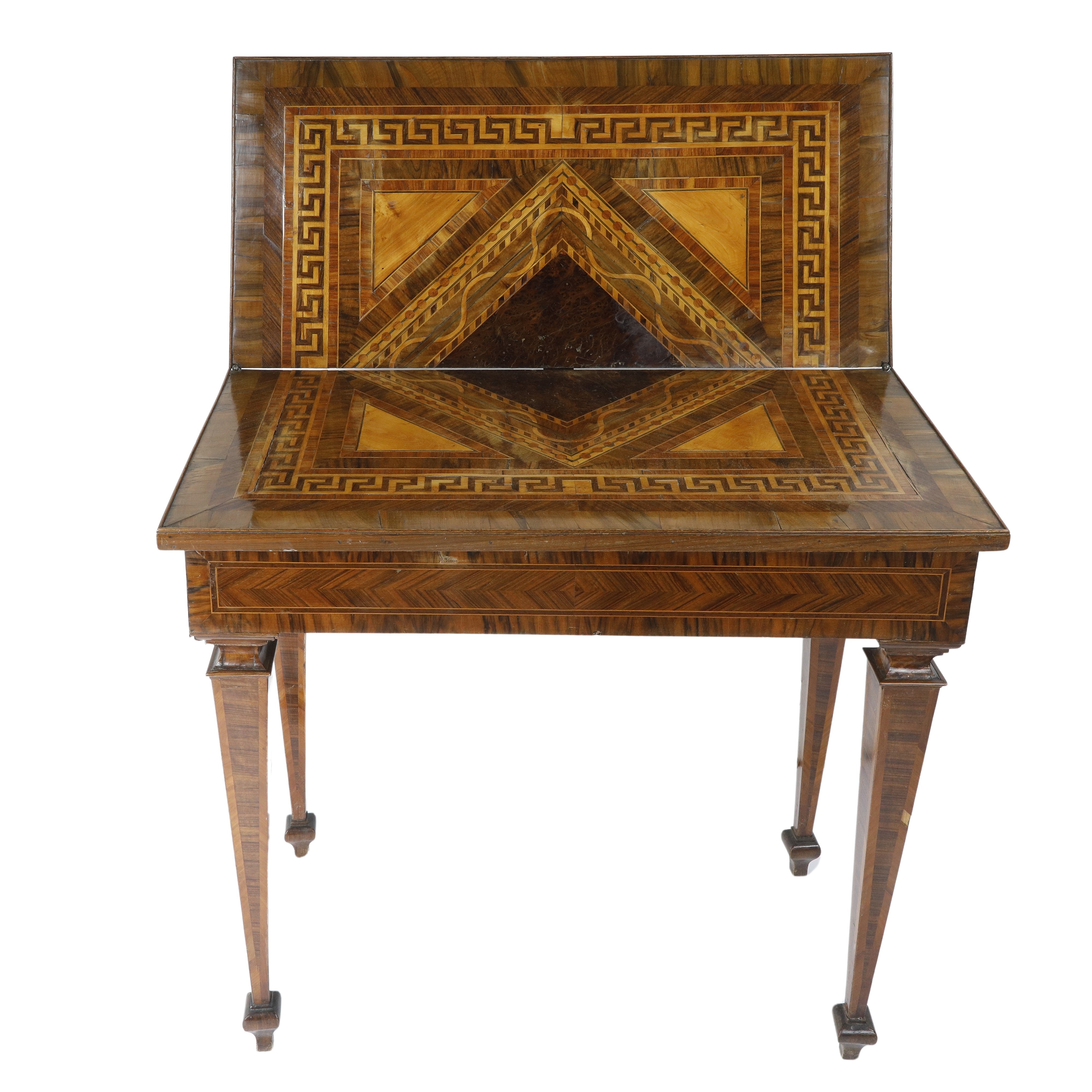 Piano a libro girevole ed apribile riccamente intarsiato anch'esso nelle stesse essenze con motivi geometrici a forma romboidale, spicchi triangolari e riquadro con greca.