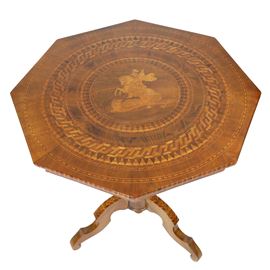 Tavolo ottagonale lastronato e intarsiato in legni vari con figura di cavaliere e drago.