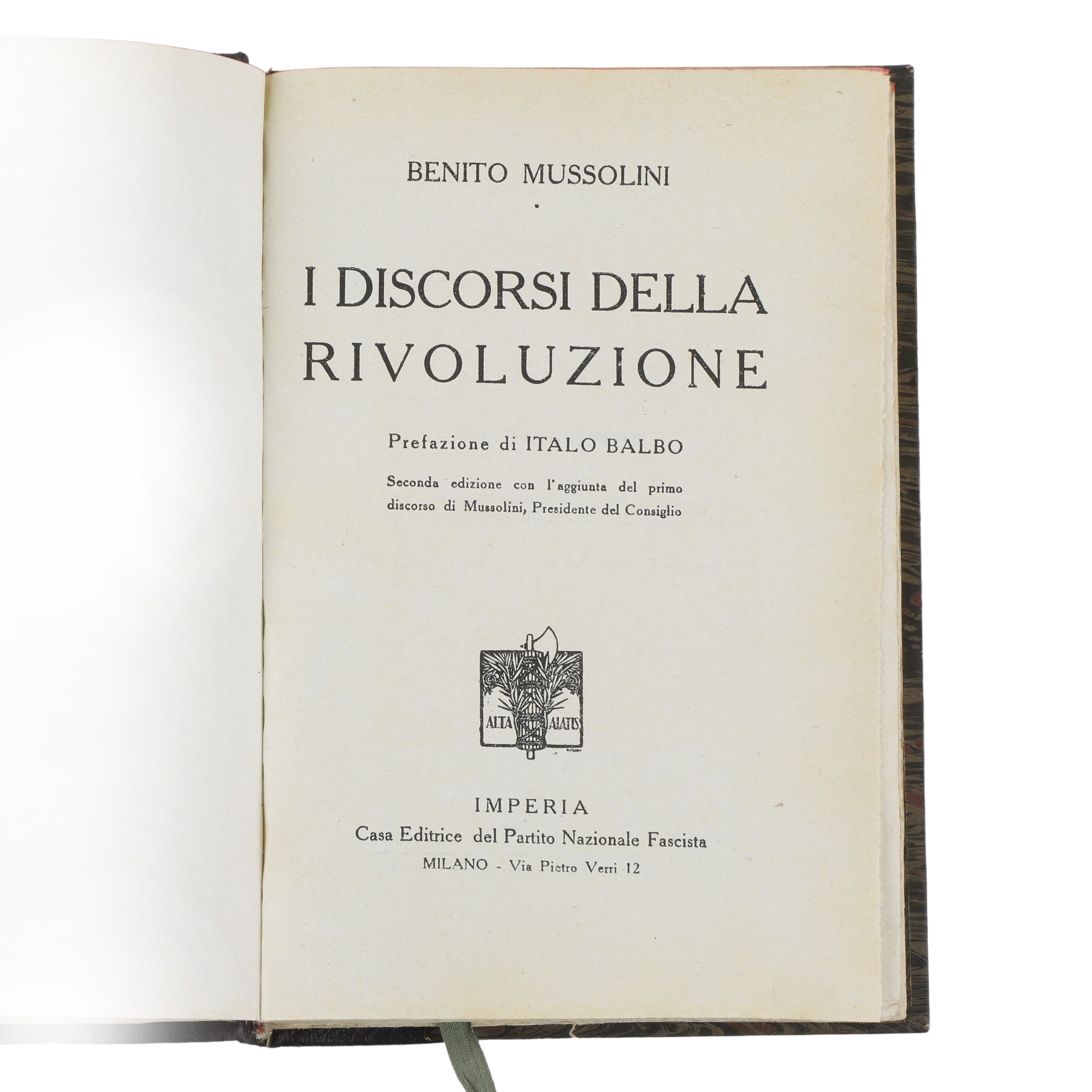 Title page bears the publisher’s logo with the fascio littorio and the motto “Alta Alatis.”