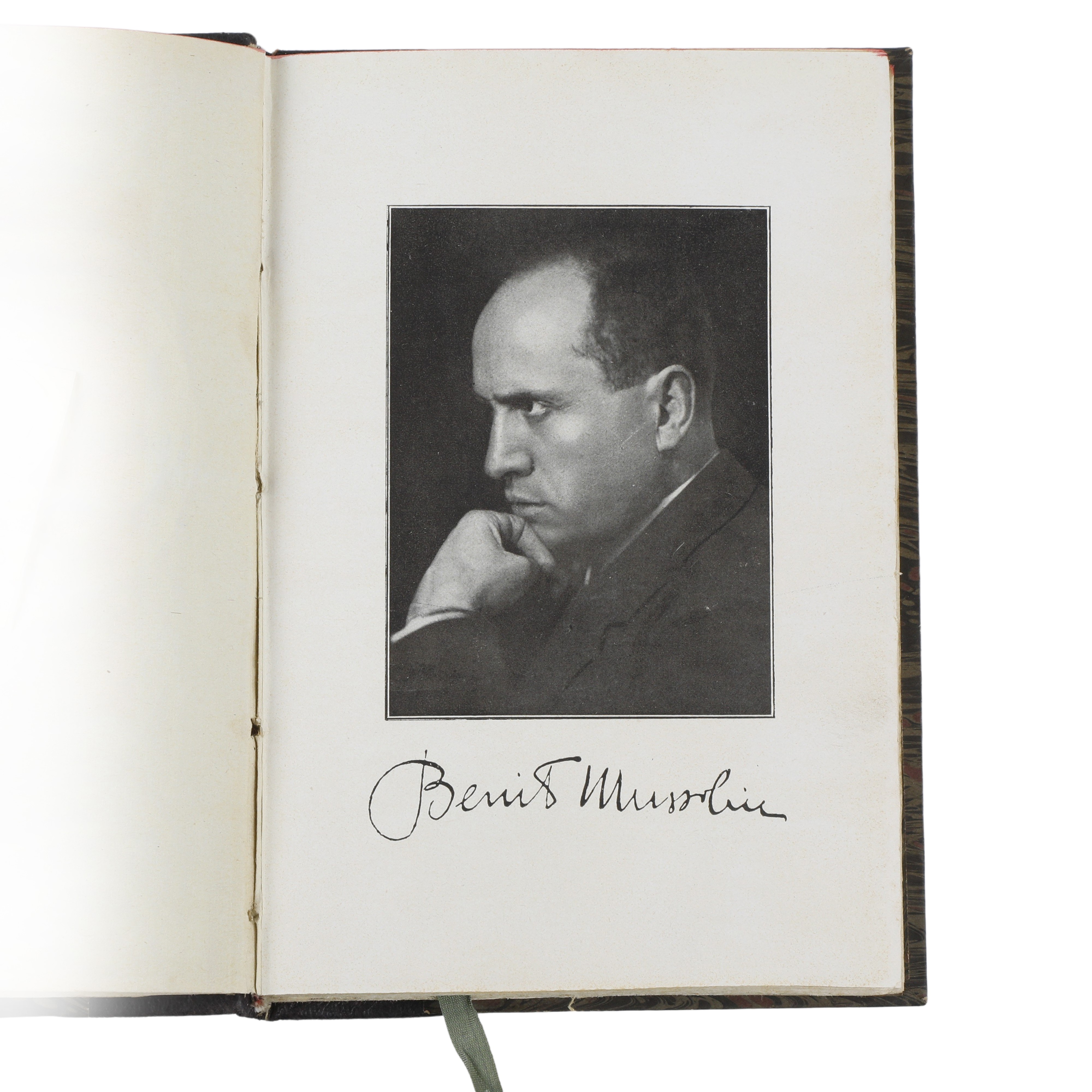 Frontispiece features a photographic portrait of Mussolini in a reflective pose, with facsimile autograph at the base.