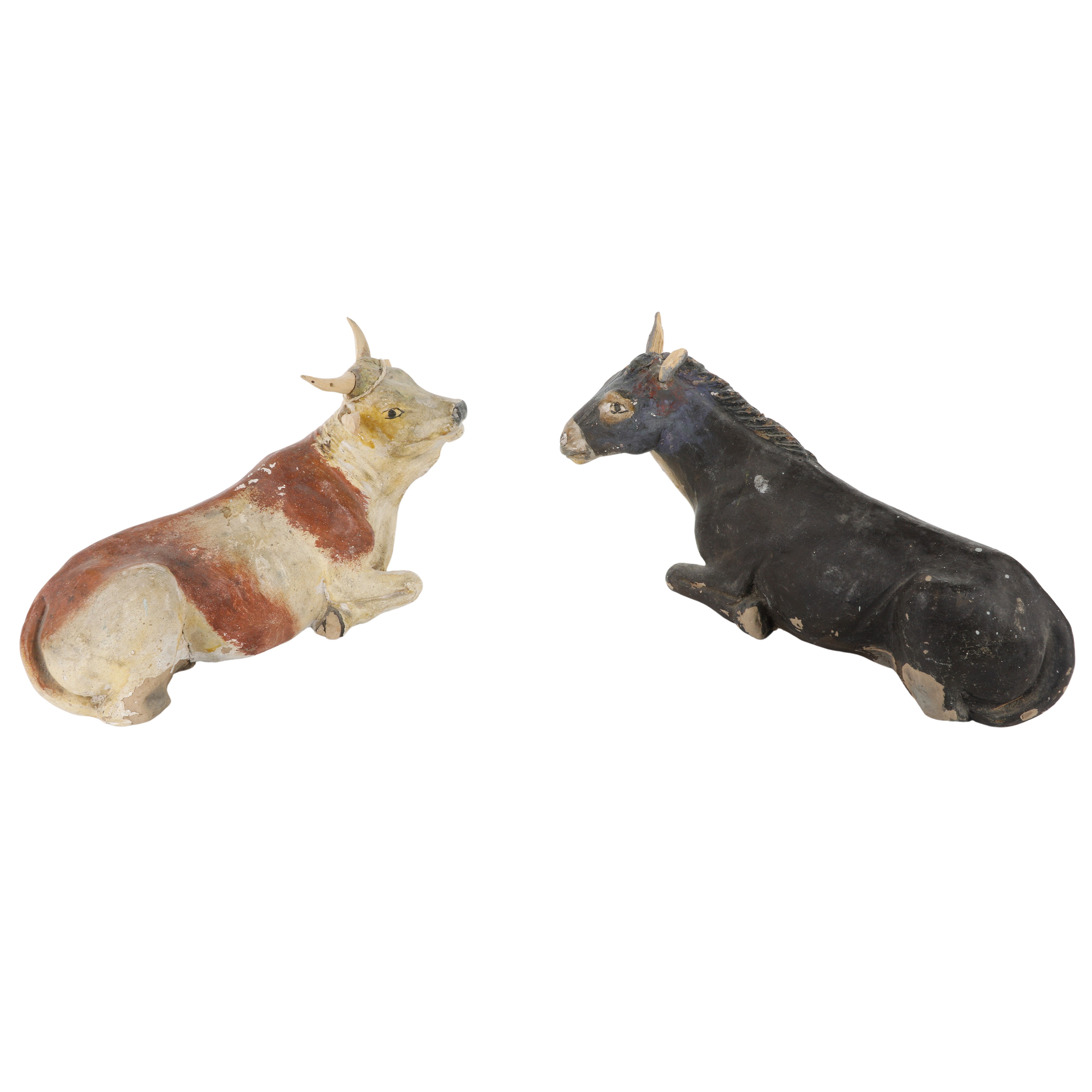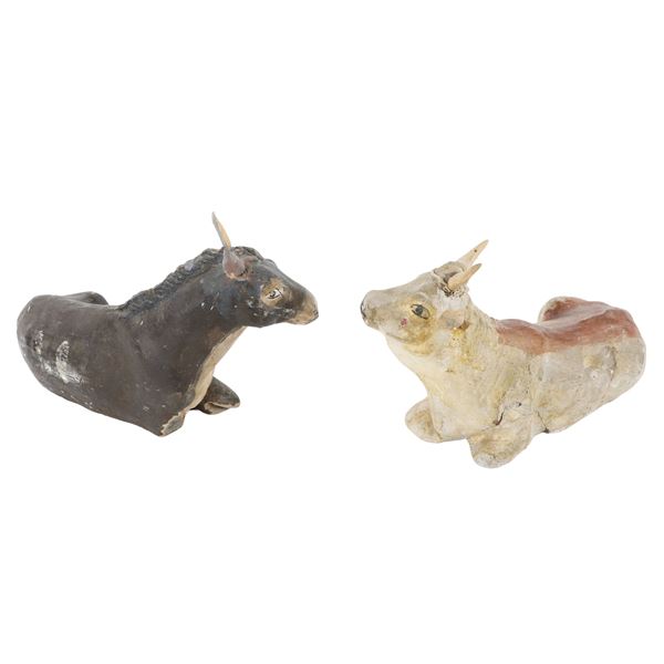 Coppia di sculture da presepe in terracotta policroma, raffiguranti il bue e l'asinello