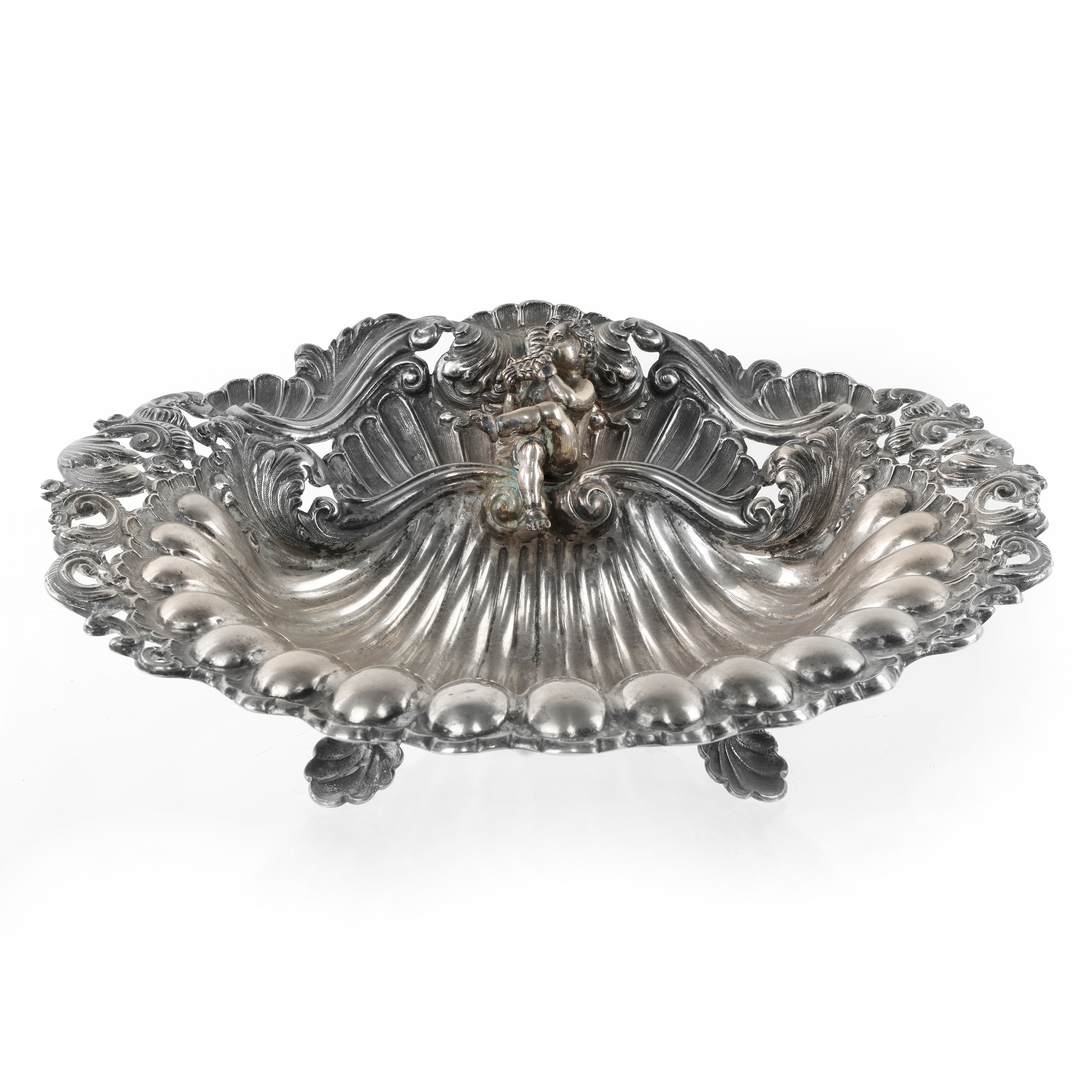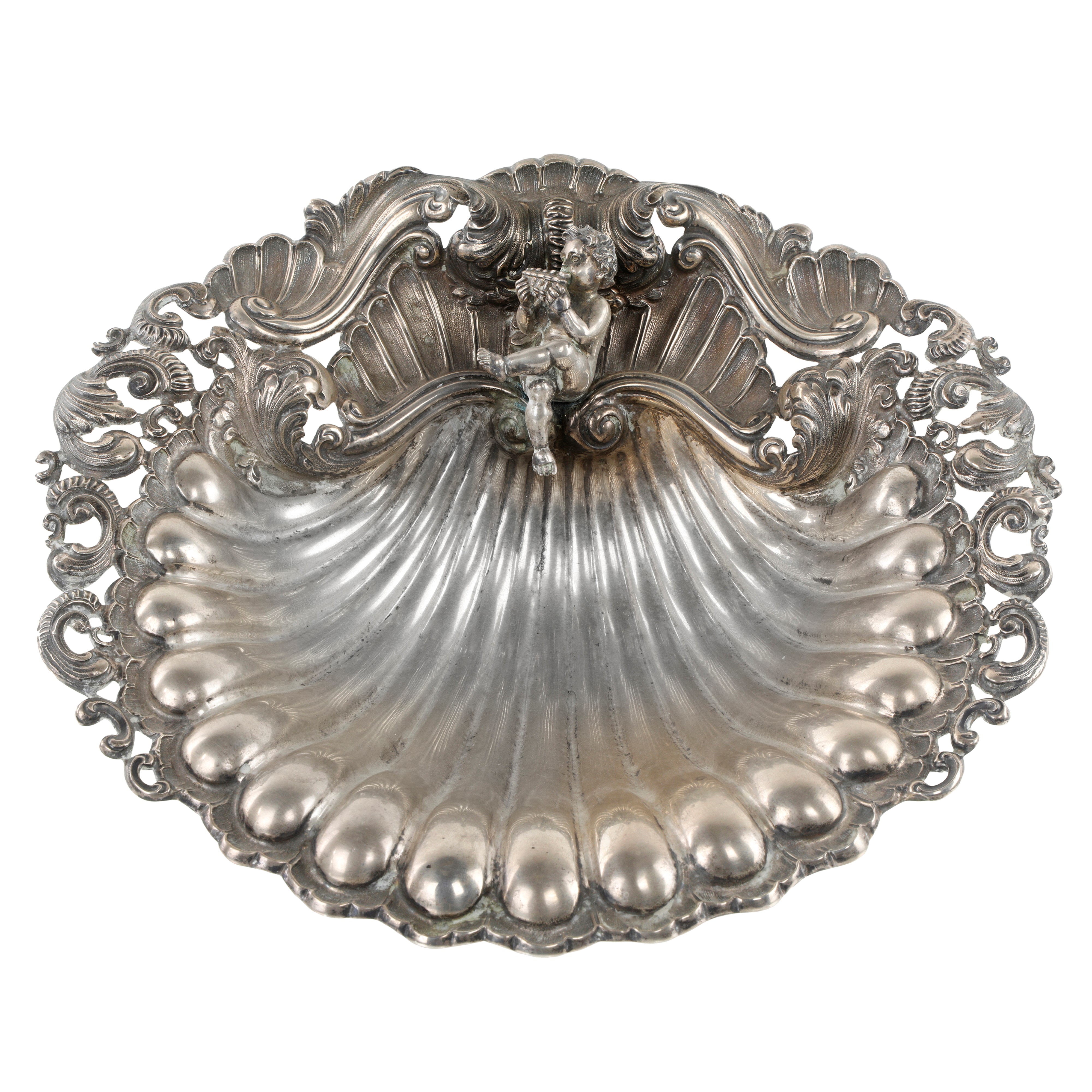 Centrotavola in Argento cesellato a forma di conchiglia , con putto musicante e volute. 3 piedini a guisa di conchiglie.