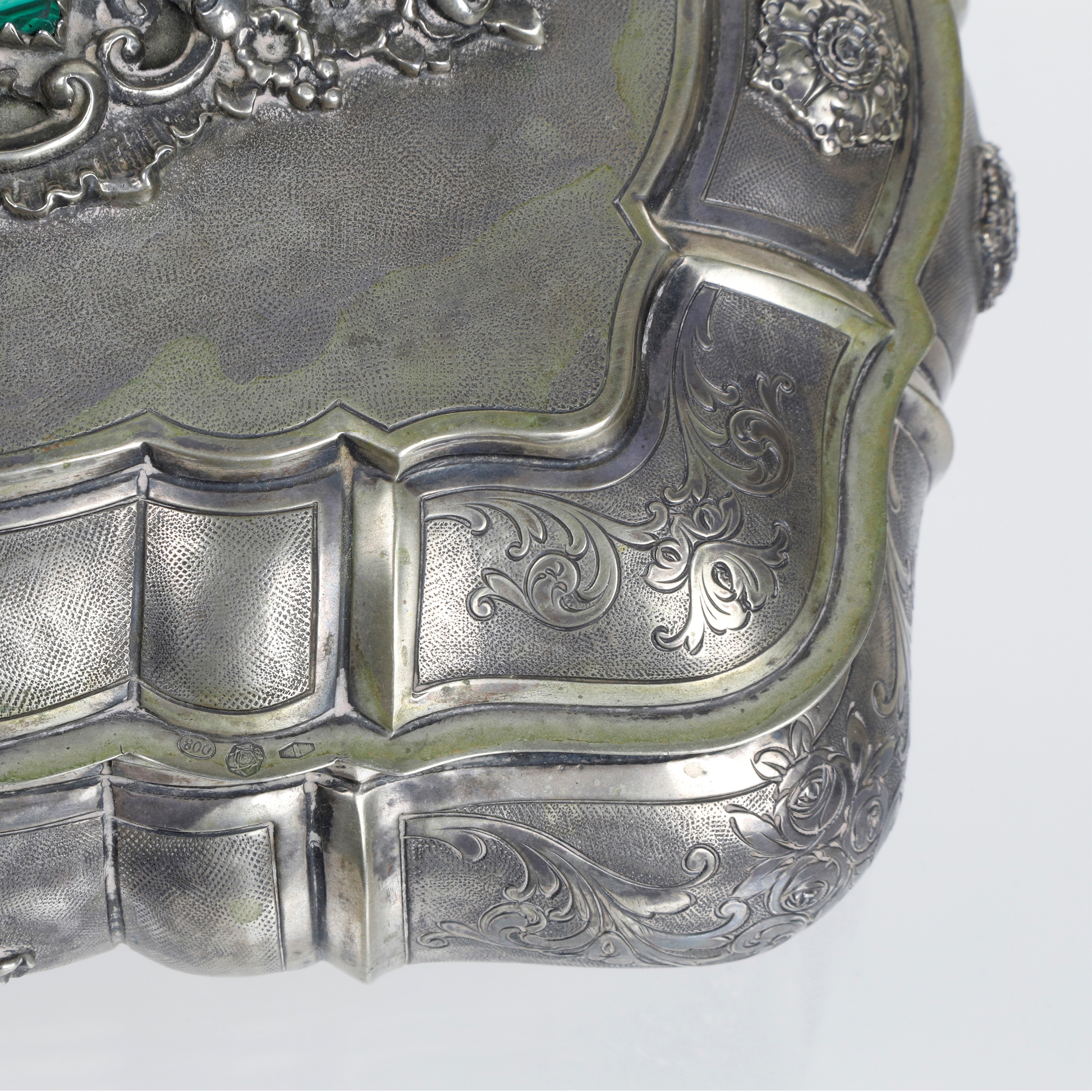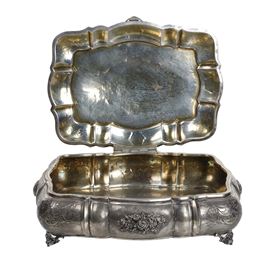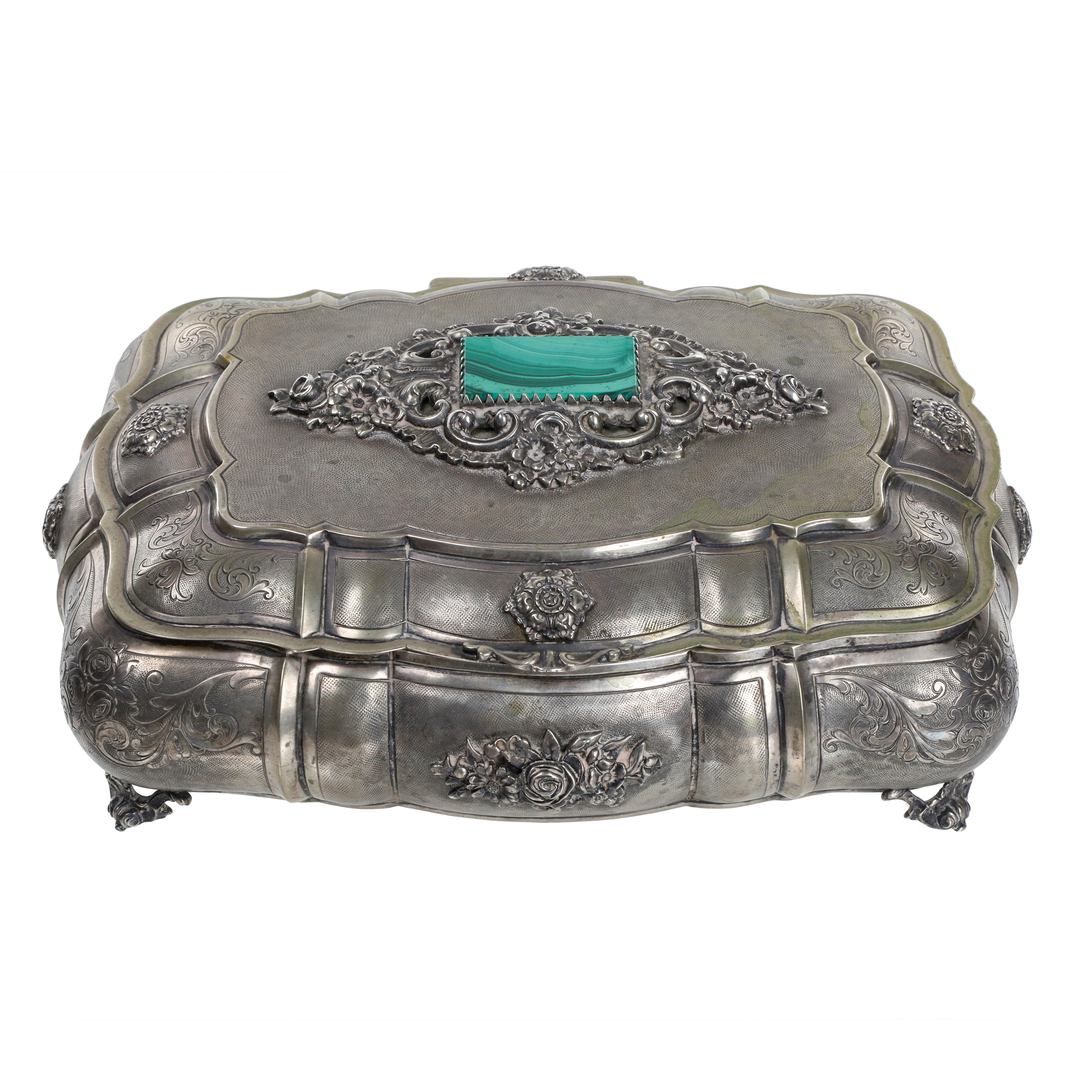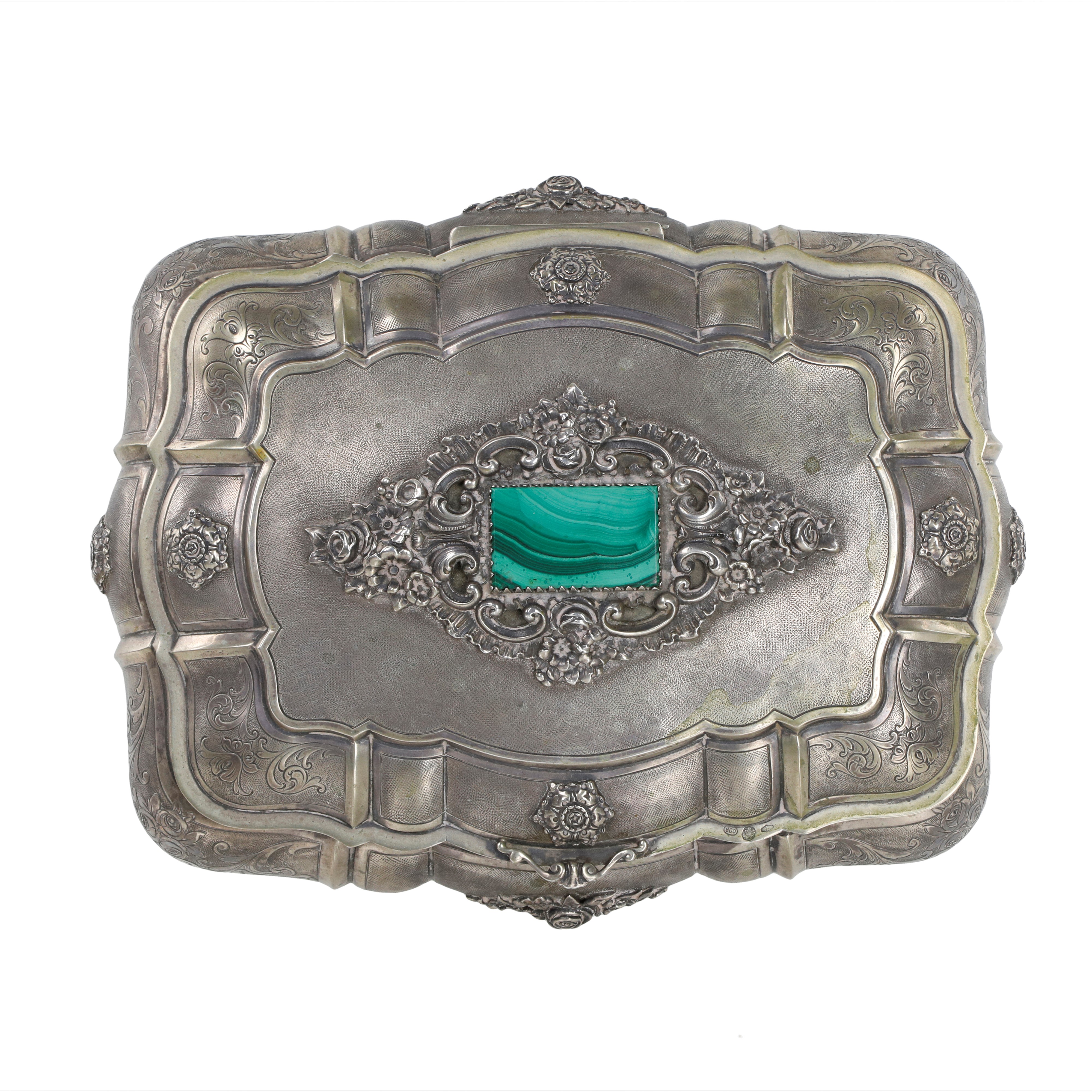 cm 9,0 x 25,5 x 21,0Splendida scatola in Argento 800. La superficie è riccamente lavorata con incisioni floreali, volute e sbalzi stile bombè. Al centro del coperchio una malachite incastonata. Poggia su quattro piedini decorati a foggia di fogliame,interno "vermeil"