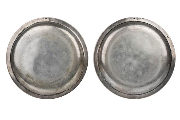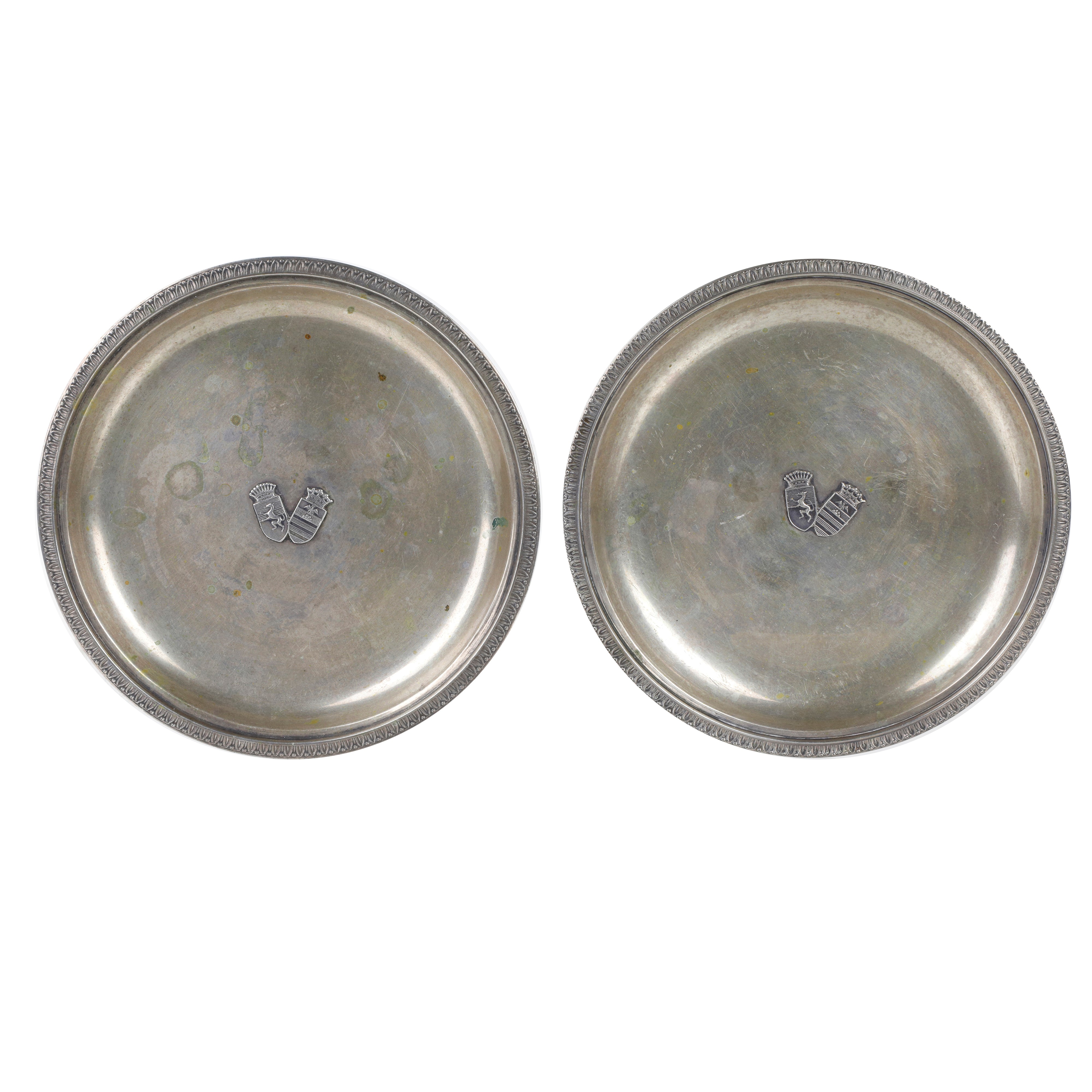 Coppia di piattini in argento con stemma Rangoni. Perimetro rifinito con un motivo a " palmette".