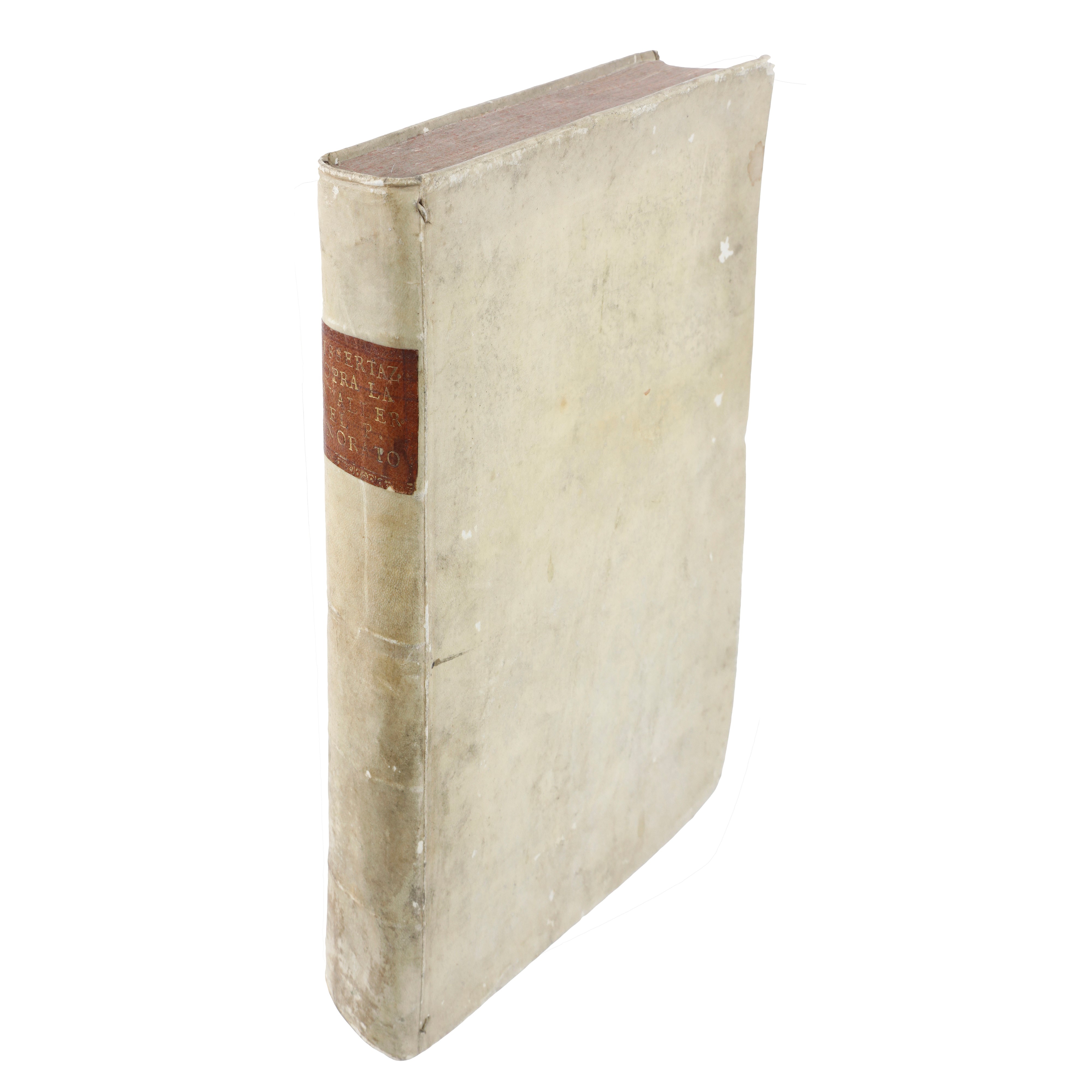 Libro in ½ Folio, copertina in pergamena rigida, prima pagina con bella incisione sotto il titolo, in seconda pagina è presente il ritratto del nobile Vincenzo Caifani a cui è dedicato il volume. L’opera è composta da due libri suddivisi in dissertazioni. Sono presenti testatine, finalini e capilettera. Al termine del primo volume come all’inizio del secondo ci sono delle piccole incisioni di chiusura e apertura del volume. In fondo al trattato sono riportate delle incisioni in rame che rappresentano le decorazioni e le collane degli ordini cavallereschi. Il volume contiene anche una breve memoria sulla Cavalleria di Costantino corredata da tre belle incisioni, di cui una rappresentante Costantino, un’altra una figura in bronzo e l’ultima il Gran Maestro dell’Ordine di Costantino. Volume completo in più che buono stato di conservazione