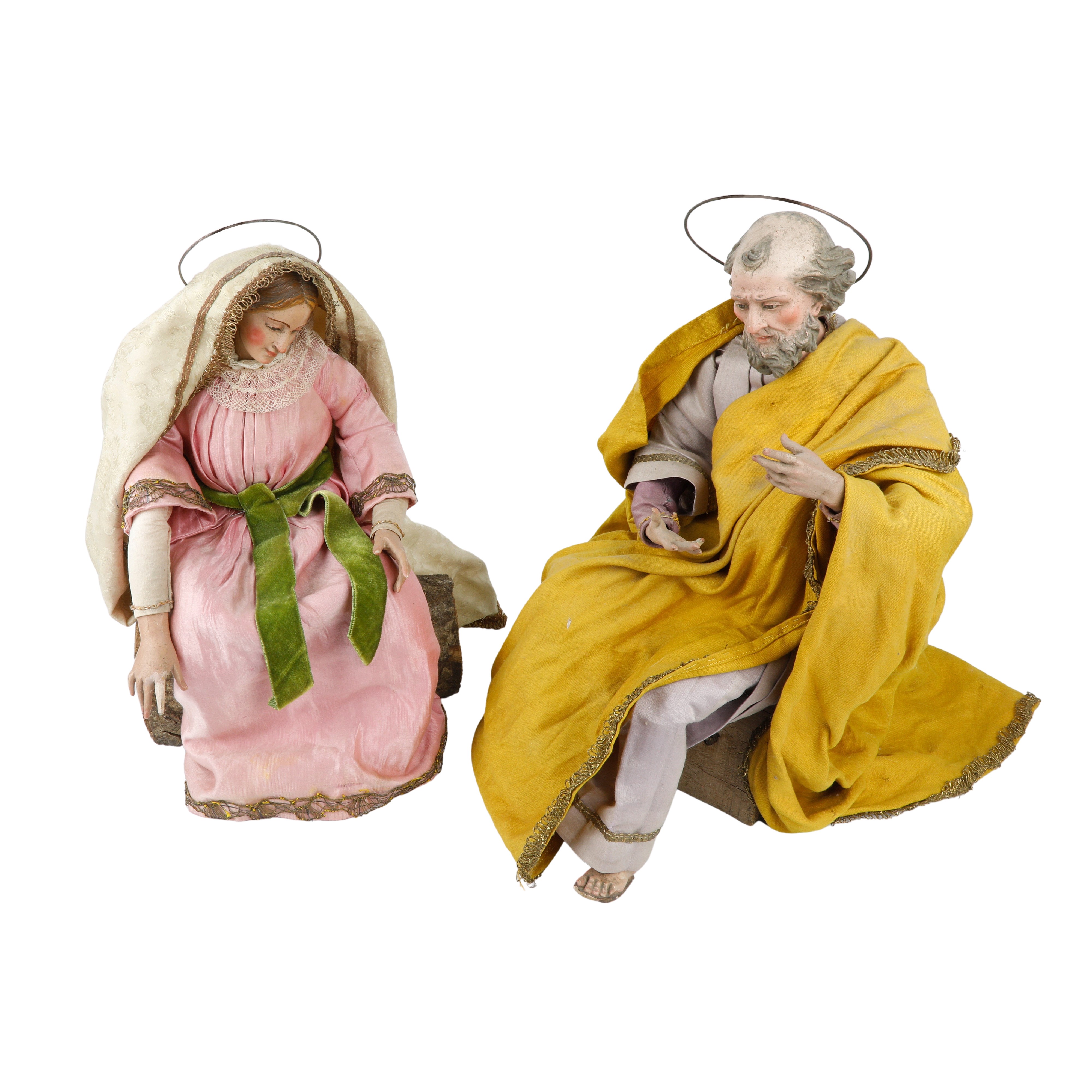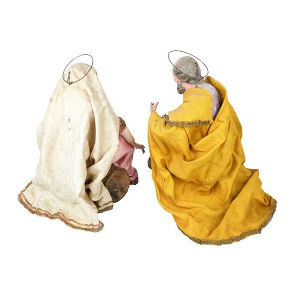 La Vergine Maria seduta e San Giuseppe seduto. Testine in terracottapolicroma, occhi in vetro, arti superiori e inferiori in legno intagliato e policromo,manichino in fil di ferro e stoppa.