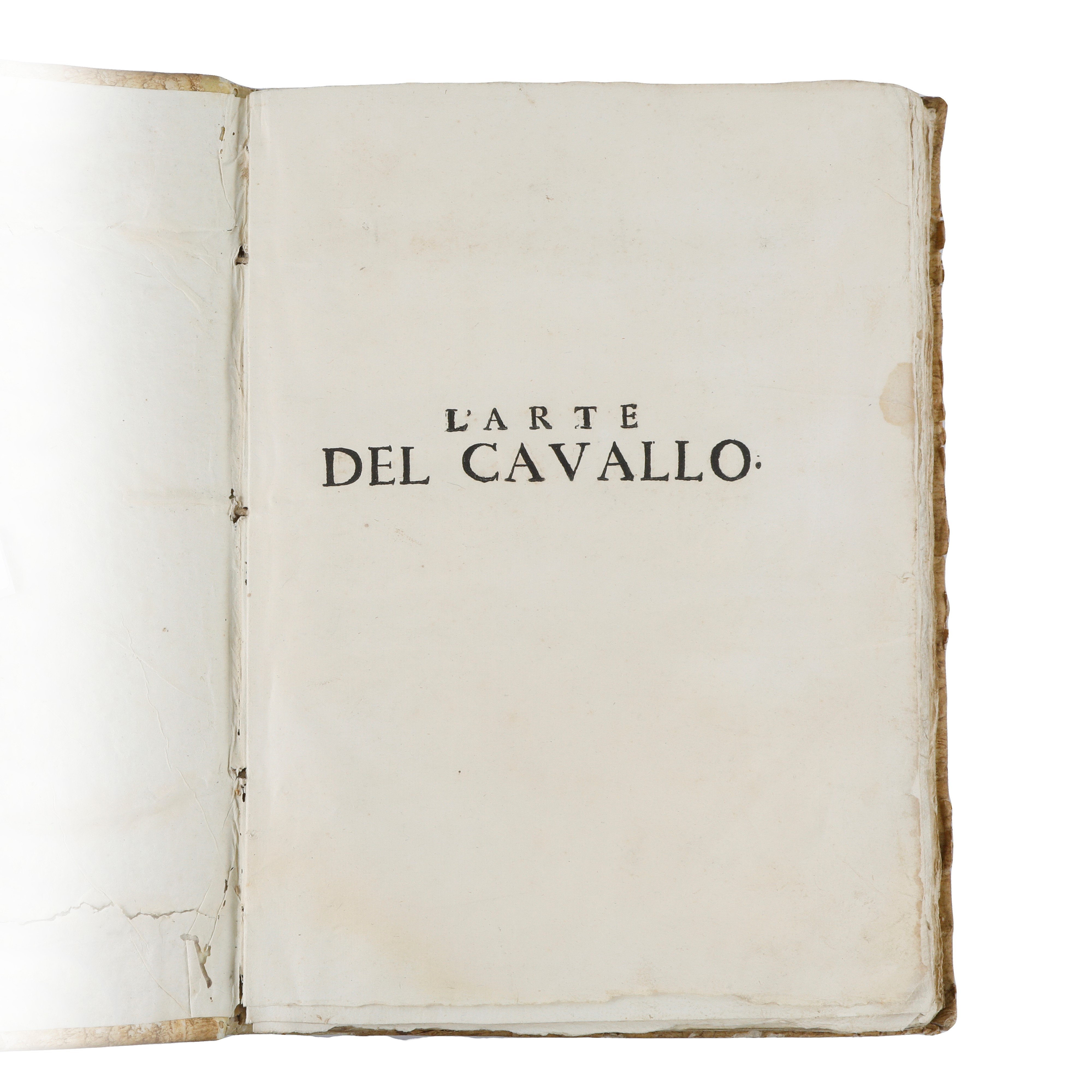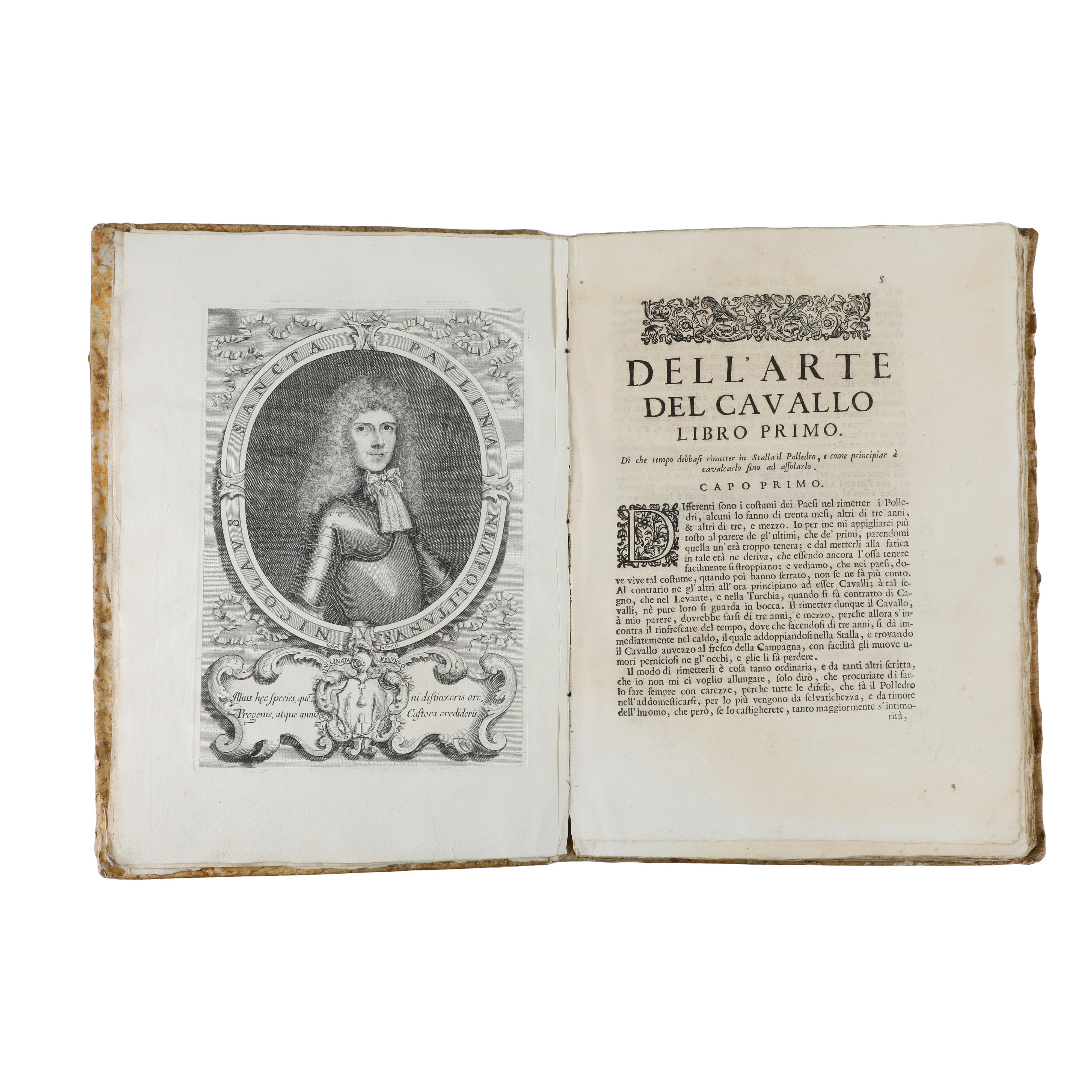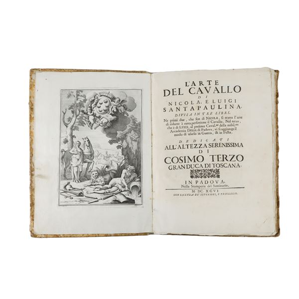 The second book contains illustrative figures of the movements the horses must perform. The volume comprises all three books and is in more than good condition, with only a few minor stains. The first two books deal with horse training, while the third (by Luigi Santapaulina) concerns the horse’s use in war and festivities. Rare volume.