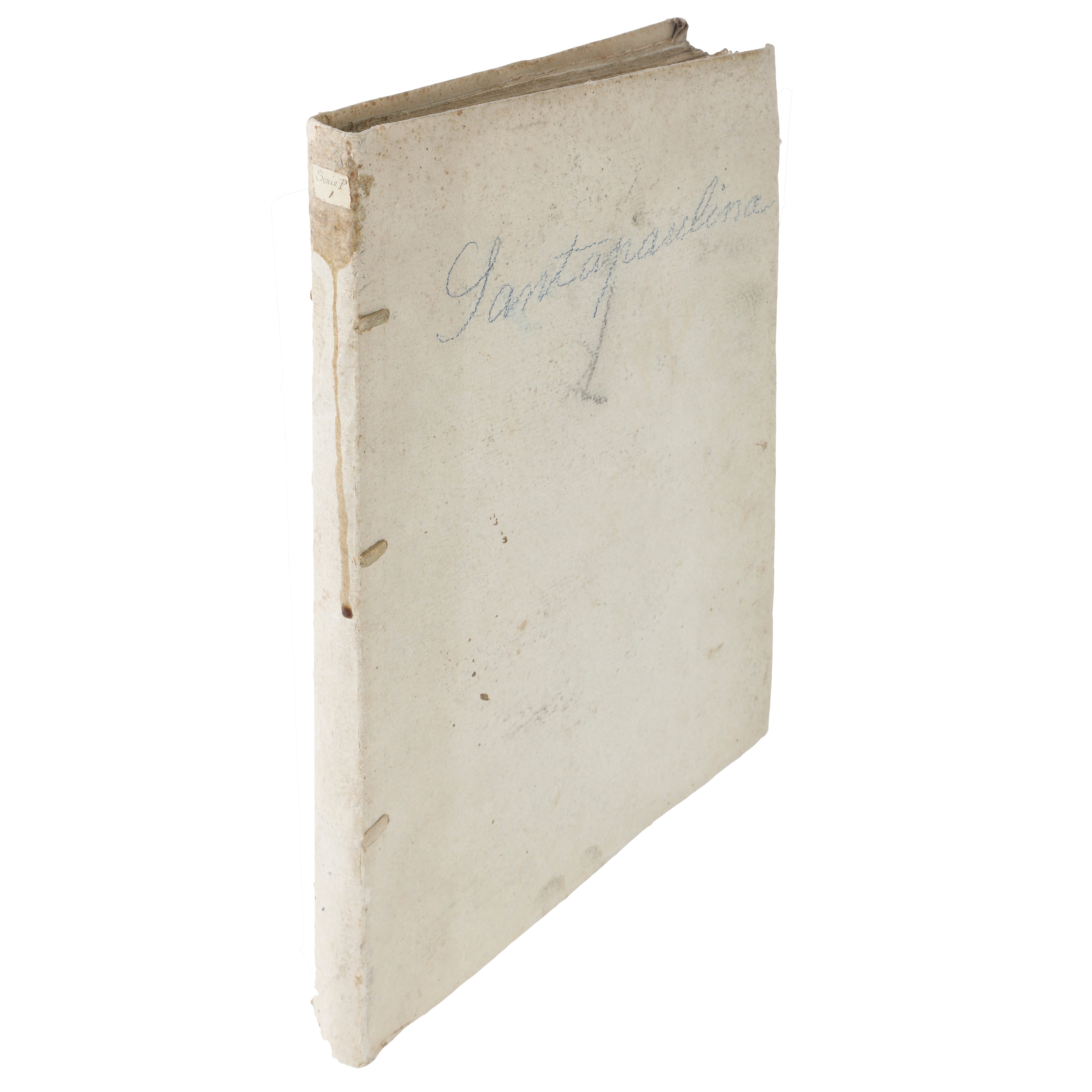 Folio volume with cardboard covers, title in pencil on the front, and reinforced binding. A fine frontispiece depicts Nicola Santapaulina with a noble coat of arms, accompanied by decorative initials and end-of-chapter ornaments. Before the first book, there is an elaborate engraving showing a horse among mythological figures, including a woman, a lion, and a reclining man near an urn pouring water; at the top, putti hold a coat of arms recalling the Medici family. The engraving was executed by Joseph Juster after a design by Louis Dorigny.