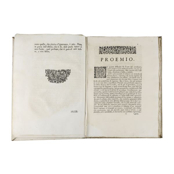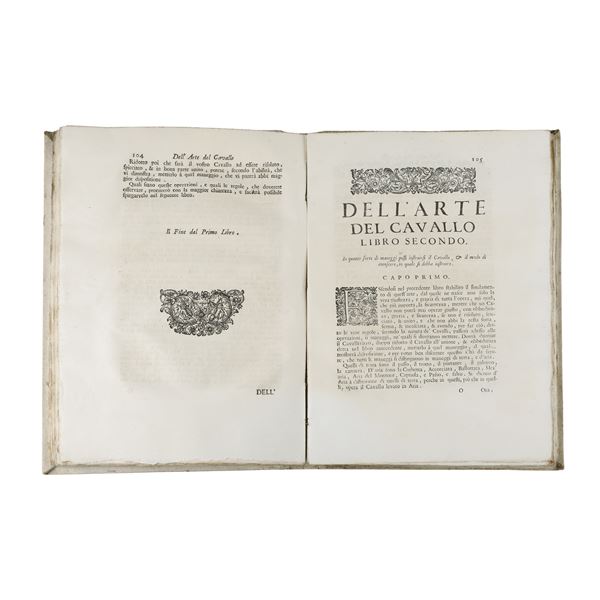 The second book contains illustrative figures showing geometrical exercises for the horse. The volume is complete with all three books and in more than good condition, with only occasional small spots of humidity. The first two books focus on horse training, while the third (by Luigi Santapaulina) addresses the use of the horse in war and ceremonial events. A rare and important treatise.