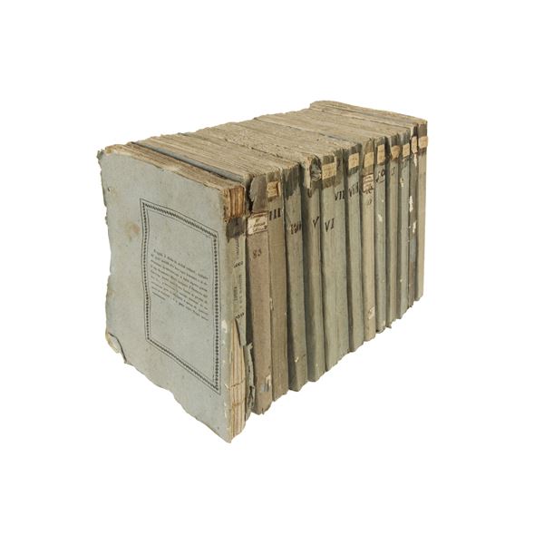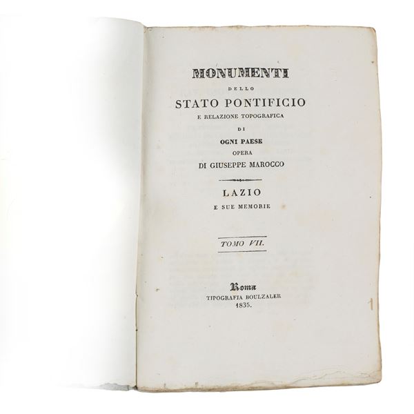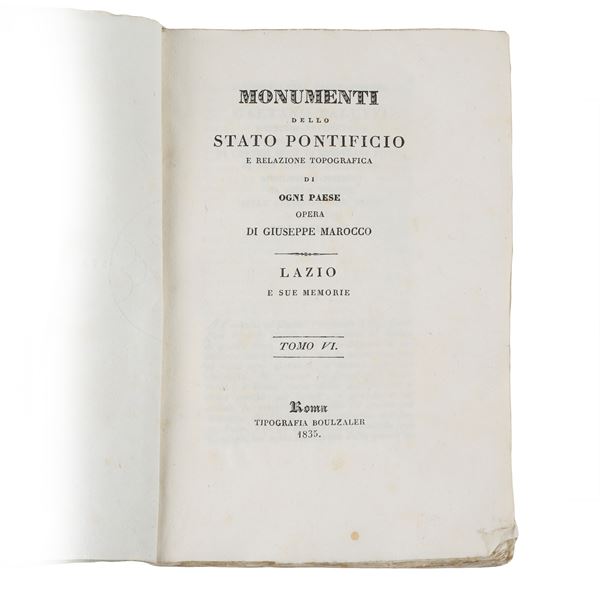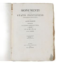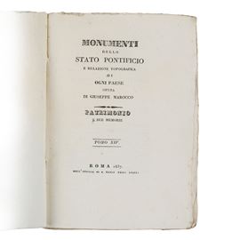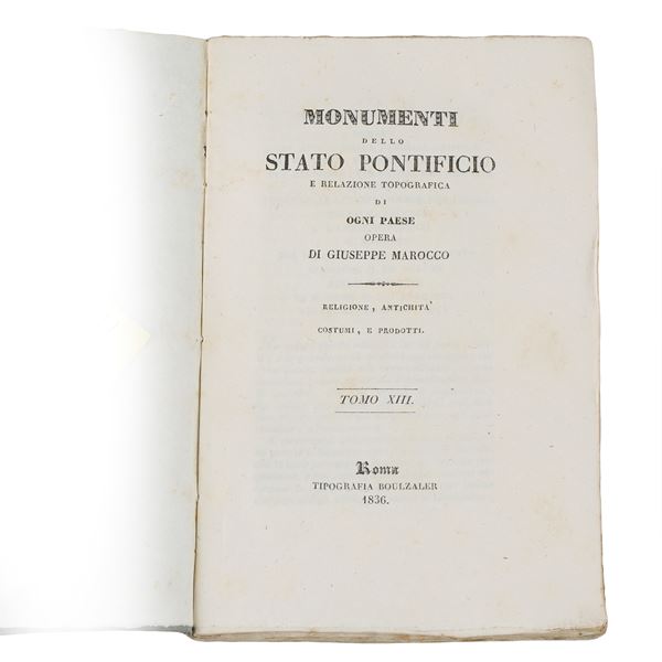 Important collection of 14 volumes (Volumes I–XI, XIII–XV) from the monumental work by Giuseppe Marocco (of Imola), devoted to the historical, artistic, and topographical description of the Papal States. The work constitutes a valuable documentary source for the study of the heritage of Lazio and the Sabina region in the first half of the 19th century.