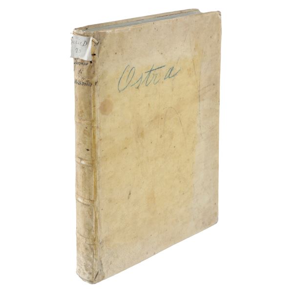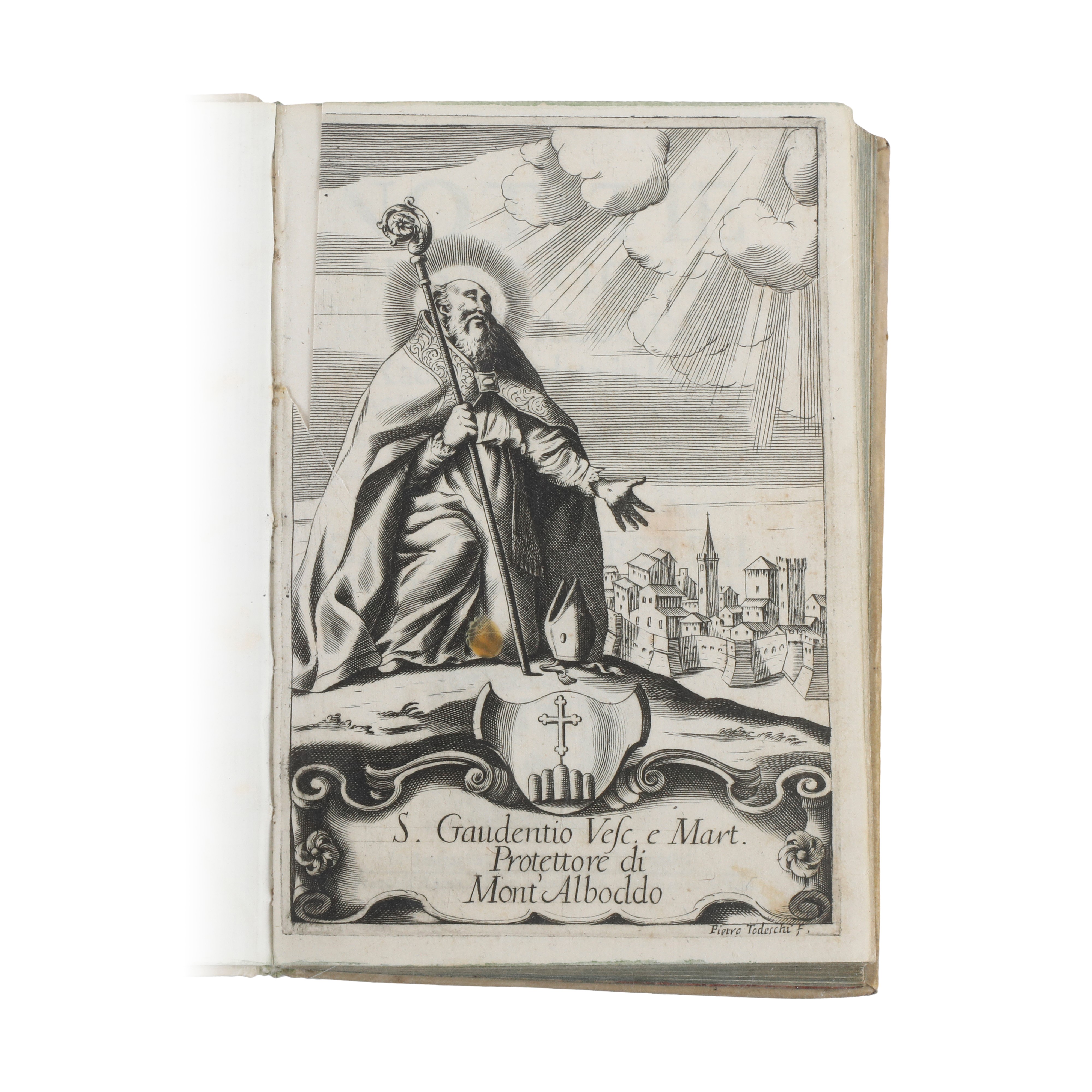 Quarter-folio volume, rigid vellum binding, with relining of the inner covers. The frontispiece engraving of Saint Gaudentius is slightly torn and beginning to detach from the text block. On the first page, at the bottom, appears the coat of arms of the Barberini family. Fine end-of-section ornaments and opening headpieces are present.