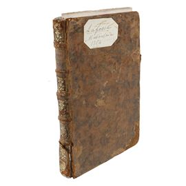Octavo-folio volume, original leather binding with raised bands and gilt lettering on the spine. Printer’s device on the title page, decorative headpieces, some wormholes, and a few pages partially detached.