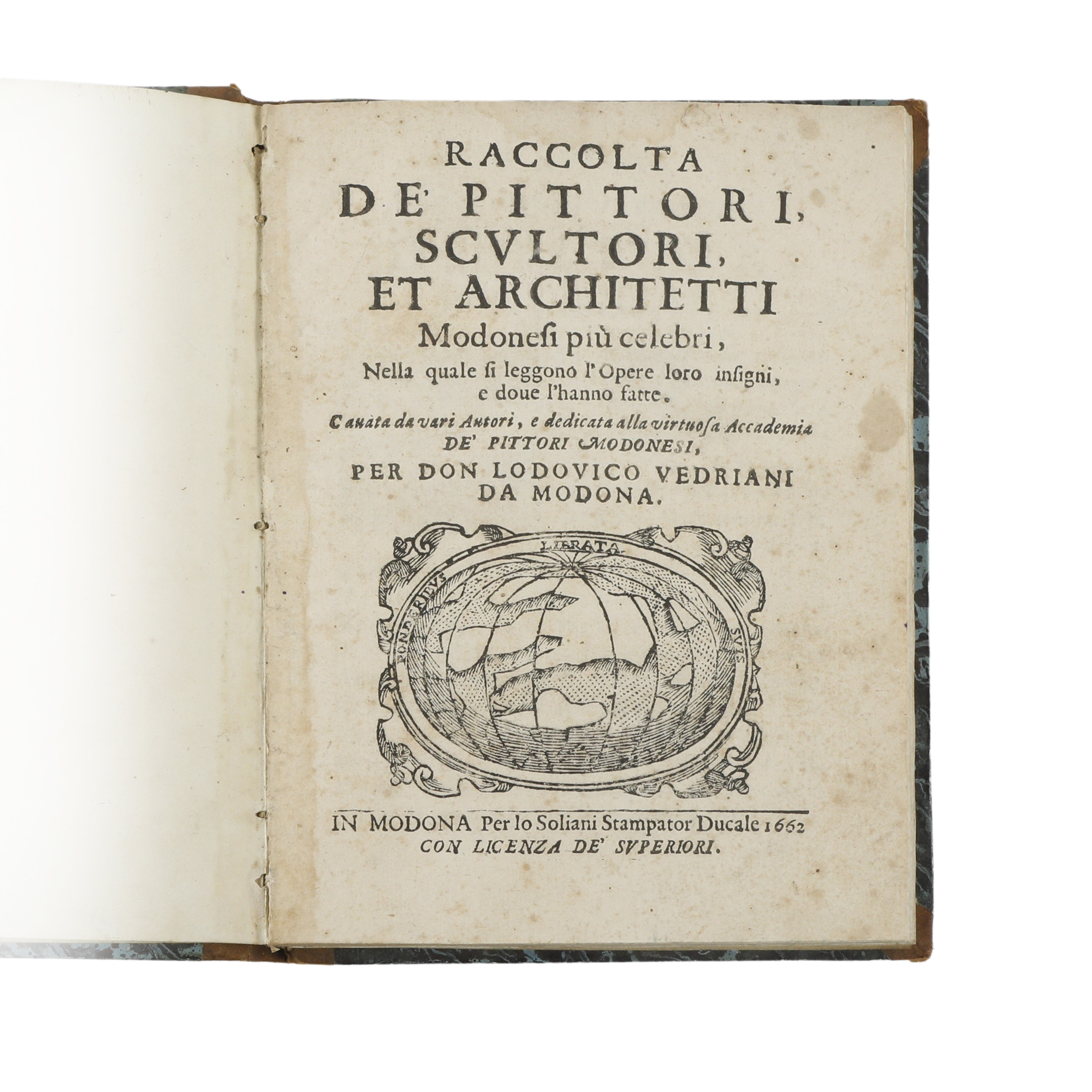 Printed in Modona (Modena) in 1662 by Soliani, Ducal Printer, dedicated to the Academy of Modenese Painters.